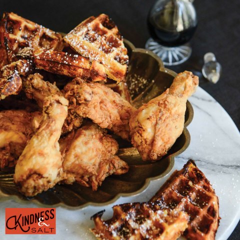 BUTTERMILK FRIED CHICKEN WITH CHEDDAR WAFFLES & BALSAMIC-SPIKED MAPLE SYRUP