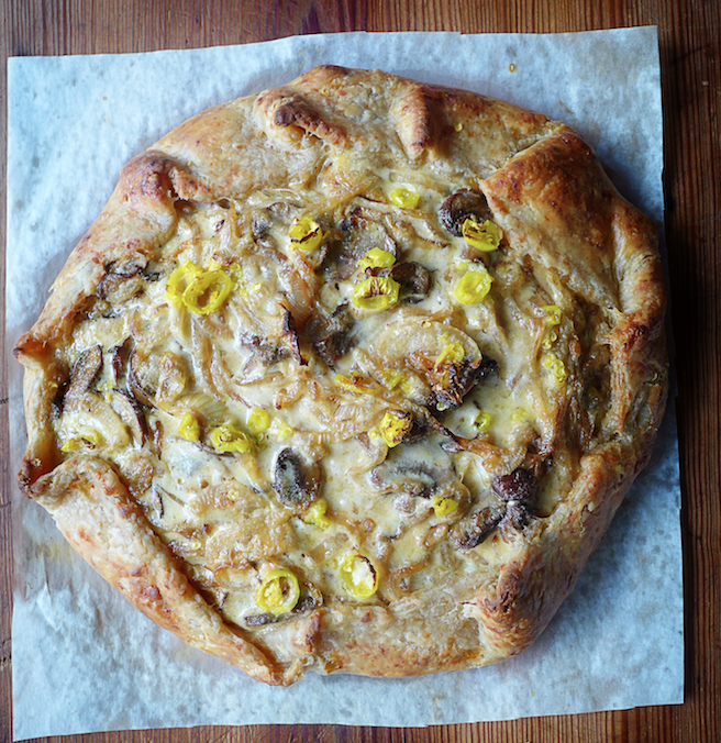 Roasted mushrooms, griddled onions, and tender steak—this pie has every element of the sandwich so ubiquitous in the City of Brotherly Love. It’s the perfect pie to extend the leftovers from a roast, the last bits of a steak, or deli roast beef. Fonduta, a pale, gooey, creamy cheese sauce fortified with an egg yolk, ties the whole thing together. I love the spike of hot pickled peppers on the top, but if your family shies away from the heat, just omit them, or griddle one sliced red or green bell pepper with the onions and add it to the filling. The onion and cheese crust takes this pie right over the top.