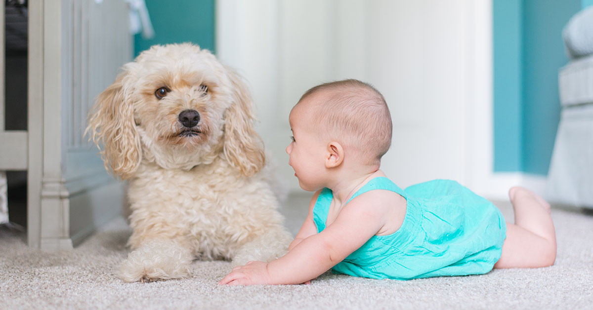 When allowing a dog to greet a baby, especially a newborn, it is essential that the dog has a calm greeting, so pick the time of day when this is most likely. Typically, dogs are most active and energized at dawn and dusk (they are crepuscular) so the best time for directed dog-baby greeting is the middle of the day. Here are some tips from professional dog trainer Lisa Edwards, author of Please Don’t Bit the Baby, on how to do so: