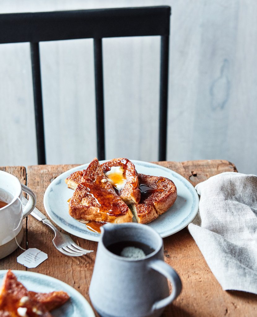 This recipe is inspired by the Griddle Cafe in Los Angeles, our favorite breakfast spot when we’re in the city. Their specialty is super-sized, slightly over-the-top breakfast classics, and I knew from my first bite of this turned-up toast that I’d be heading straight back to my kitchen to figure out how to re-create it. The key is using a thick, sweet bread like brioche (though Texas toast can also do the trick), coating it with a cinnamon-sugar streusel that gets griddled right into the toast, then finishing off the whole stack with a slab of butter, a drizzle of maple syrup, and an extra sprinkling of streusel to melt over the top. One slice will just about send you into the happiest sugar coma ever! I like breaking out this recipe for special occasions when I want to serve something extra indulgent for breakfast, especially around the holidays.