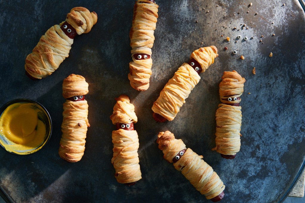 Separate the dough into strips. Using a pizza cutter, cut the dough into 1/4-to 1/2-inch-wide strips. Set aside a couple of strips for the mummies’ eyes. Wrap strips of dough around each sausage dog, leaving a 1/2-inch gap uncovered at about two-thirds of its length for a face. Arrange the wrapped sausage dogs on the prepared baking sheet.