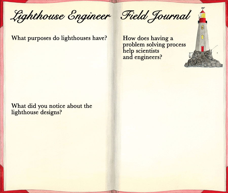 In a small group, talk with your fellow engineers and sketch out a few ideas. Talk about what you have learned about the reasons for lighthouses and the different kinds of lighthouse designs you have explored. (Look at your field journals to refresh your memory.) Remember, your idea only needs to solve the problem of warning sailors of danger. You do not need to design a lighthouse. You may want to sketch ideas on your own and then share with the group or work together on one design. You will need to decide as a group, though, on one final design. Then, go to the engineering space and create a model of your idea using the materials available.
