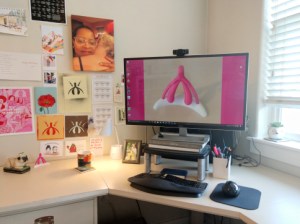 You’ll notice the giant clitoris screen saver. Most sex scenes in film, tv, literature, and porn prioritize the male anatomy and are designed around the male sexual response. I think women-loving-women romance is a great place to showcase sex scenes that are truly female focused. Spreading cliteracy is my mission. Apparently, I’m starting with my office. And, of course, there’s a big picture of my wife because she’s my inspiration.