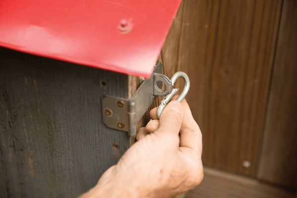 - Hinges. The hatch for our nest box has hinges at the bottom and latches on the sides. You could use gate hinges from the hardware store; choose ones that are made for outdoor use and won’t get rusty. Make sure the screws aren’t so long that they poke inside the box.