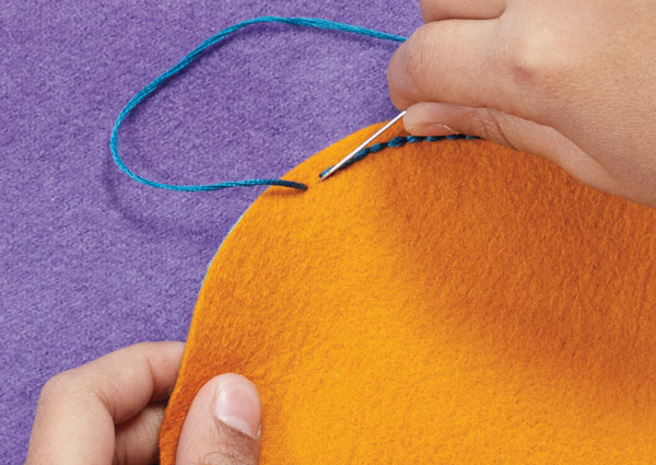 - Measure an arm’s length of embroidery floss, thread your needle, and knot the end. Starting in between the two layers, push your needle up through the top piece of fabric and pull the thread through until the knot is snugly against the underside.