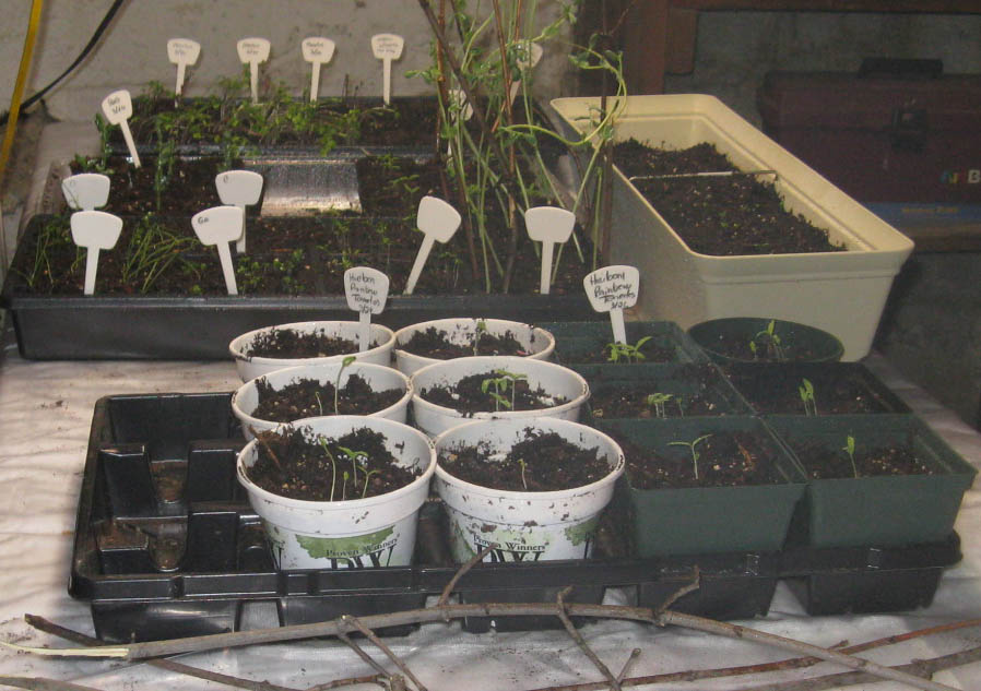 Tomatoes and other vegetable seedlings growing under fluorescent lights in my basement; April 2009
