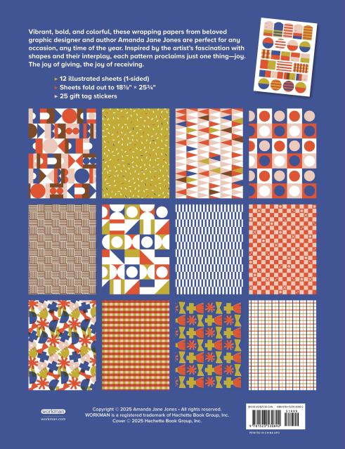Perfect for wrapping presents for birthdays, holidays, and special occasions, this curated collection features Amanda Jane Jones’s signature style of combining vibrant colors with bold patterns and designs. The book includes 12 perforated sheets that detach and unfold to 19 5/8″ by 25 3/4″, along with 12 matching gift tag stickers.