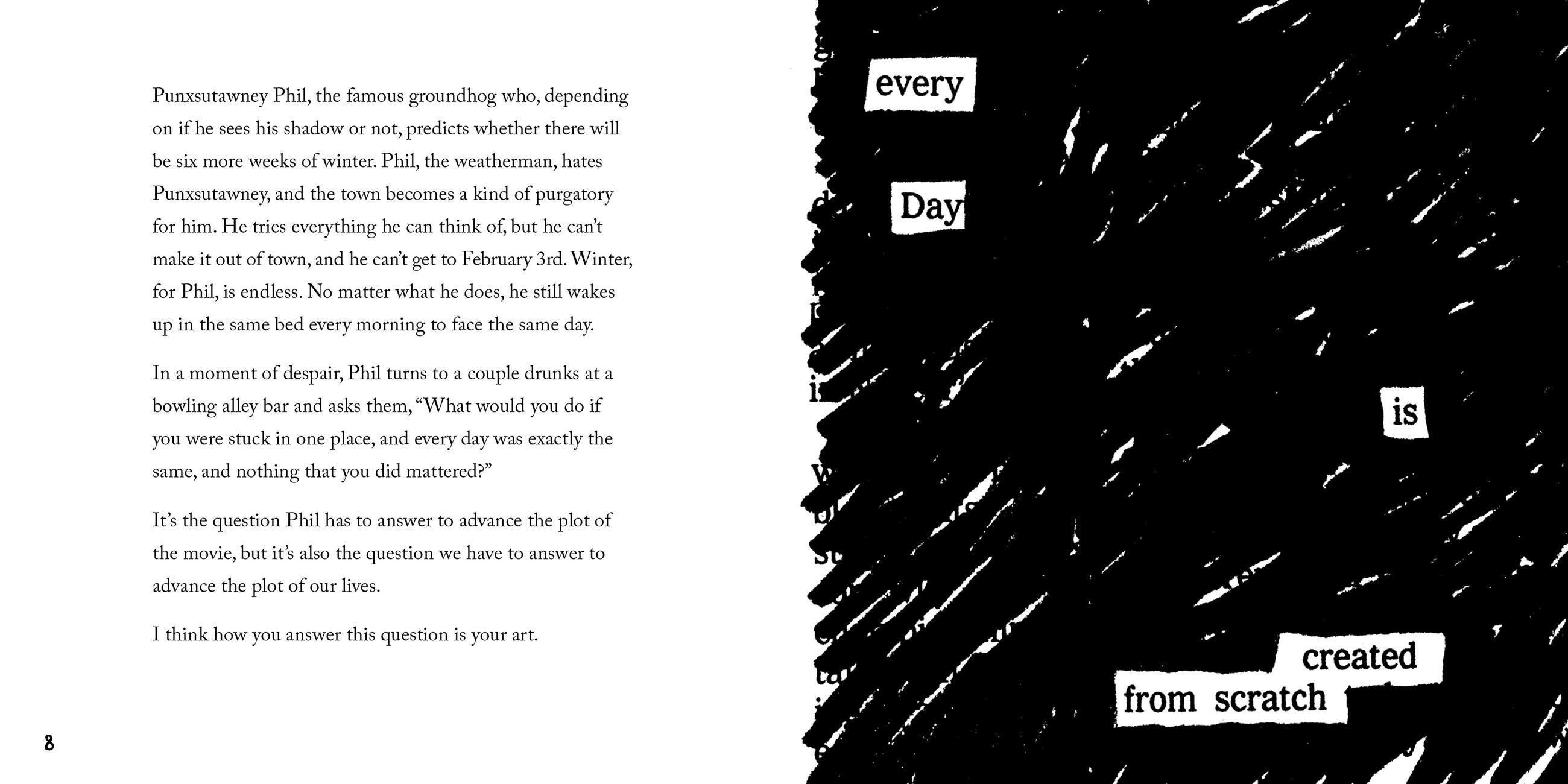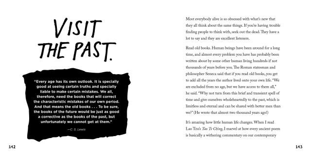 The creative life is not a linear journey to a finish line, it’s a loop—so find a daily routine, because today is the only day that matters. Disconnect from the world to connect with yourself—sometimes you just have to switch into airplane mode. Keep Going celebrates getting outdoors and taking a walk (as director Ingmar Bergman told his daughter, ”The demons hate fresh air”). Pay attention, and especially pay attention to what you pay attention to. Worry less about getting things done, and more about the worth of what you’re doing. Instead of focusing on making your mark, work to leave things better than you found them.