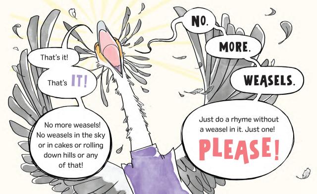 The sensible Secretary Bird wants nothing more than to get on with their job of properly narrating a classic nursery rhyme book. But something is afoot in the orderly land of nursery rhymes . . . a zippy little Weasel has entered the scene! As the Secretary Bird tries to get through the rhymes—from Little Miss Muffet to Jack and Jill—the Weasel bursts in, throwing everything into a comical tailspin. Can the Secretary Bird put an end to the chaos?