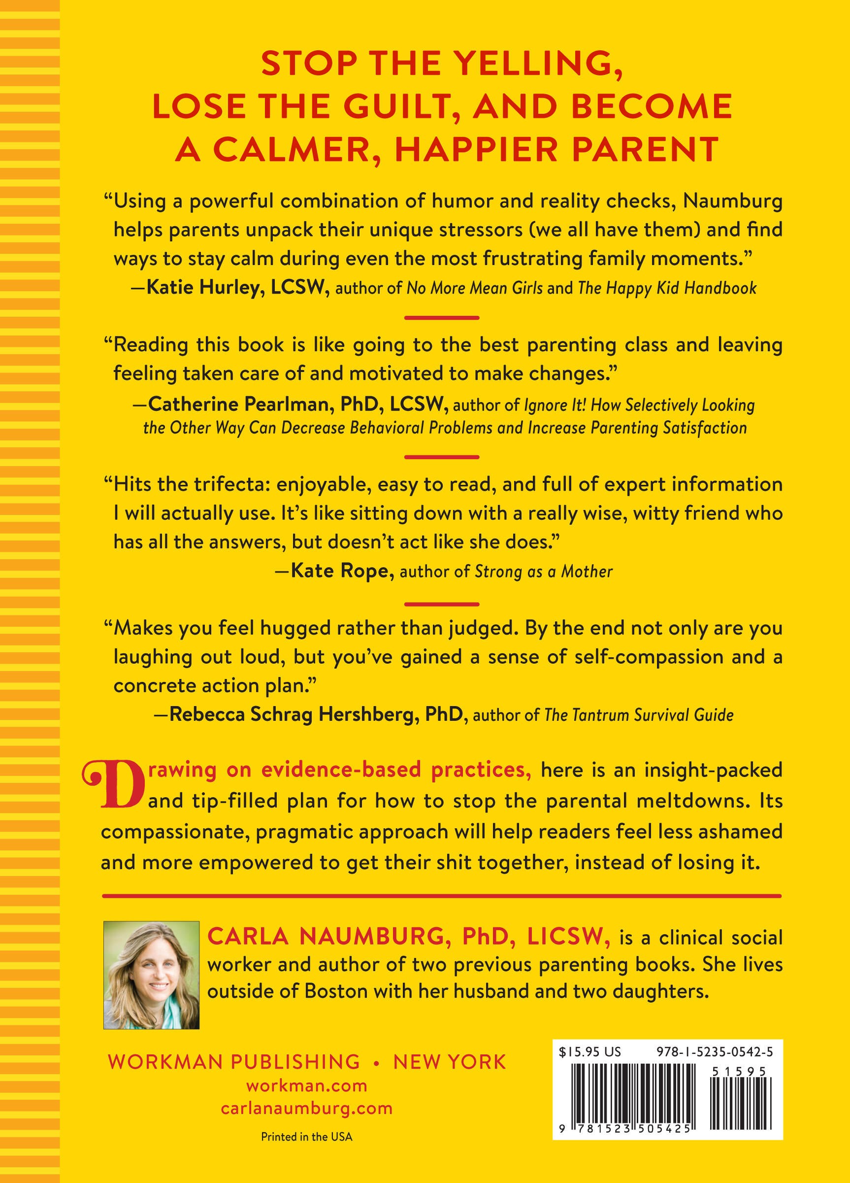 “Using a powerful combination of humor and reality checks, Naumburg helps parents unpack their unique stressors (we all have them) and find ways to stay calm even the most frustrating of family moments.” —Katie Hurley, LCSW, author of No More Mean Girls and The Happy Kid Handbook