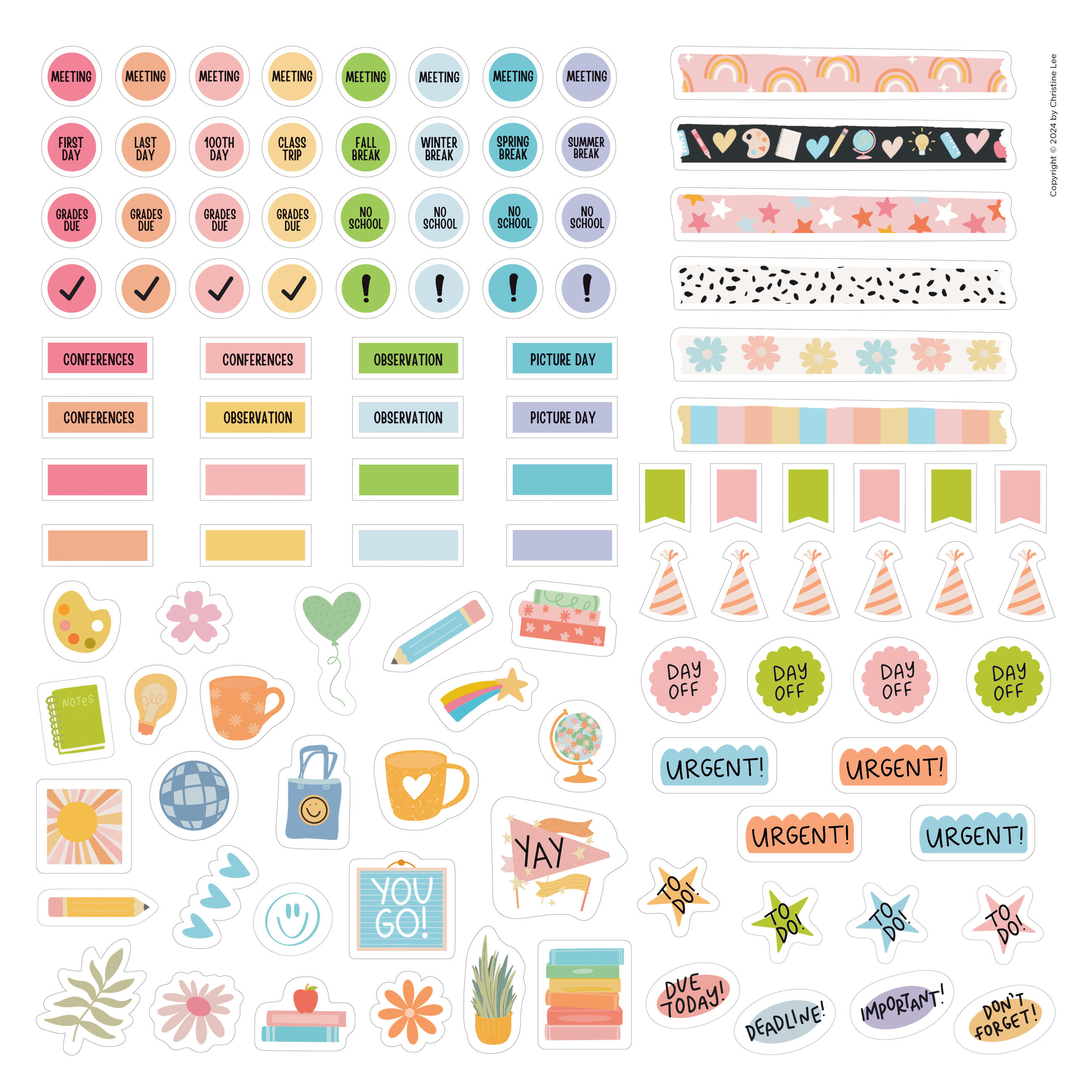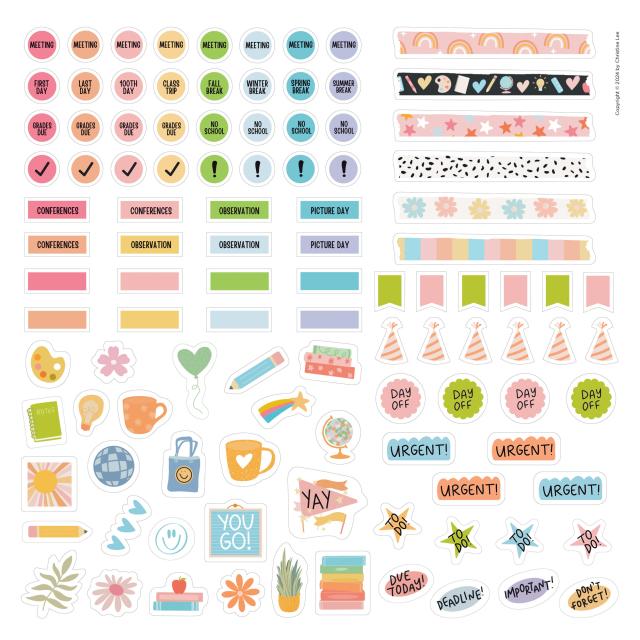 - FUN AND FUNCTIONAL: Illustrated with charming hand-lettering by elementary school teacher and designer Christine Lee. Plus colorful stickers for tracking days off, class trips, conferences, and more!