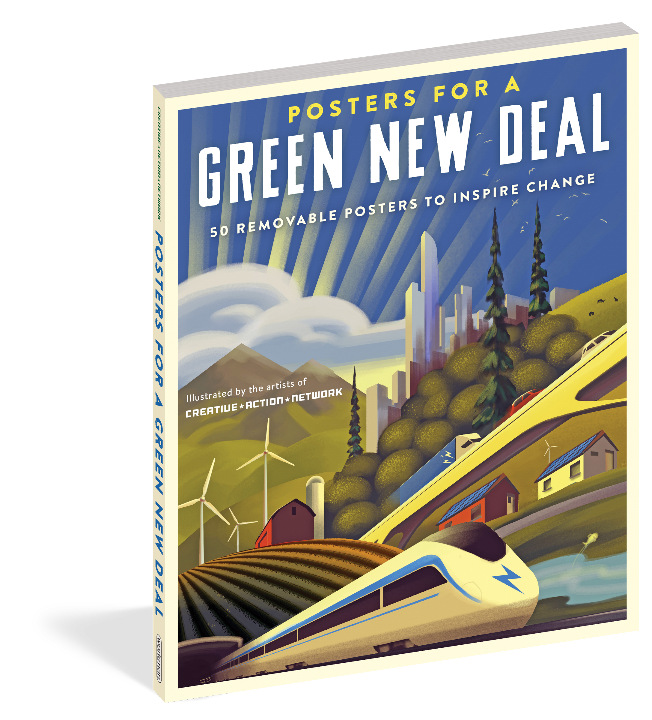 Posters with a purpose. A clarion call for our time, the Green New Deal is a bold and far-reaching legislative plan to fight climate change, create millions of good-paying jobs, promote economic and racial equality, and so much more. In its ambition, it’s a vision that mirrors President Franklin D. Roosevelt’s New Deal, which helped pull the country out of the Great Depression. And just as WPA artists mustered support for the New Deal with their work, here are 50 powerful posters to champion the Green New Deal. The posters are original, colorful, and visually striking, with text on the back that explains each issue and how the Green New Deal seeks to address it. Perforated pages make them easy to tear out and hang or use as signs at marches and demonstrations, because it’s not just a book to flip through. Climate change affects everything: the air we breath, the water we drink, the food we eat, the places we call home, and the people we love. And the time to act on it is now.