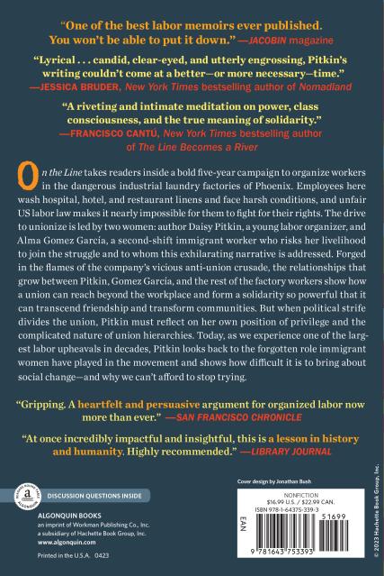 On the Line takes readers inside a bold five-year campaign to organize workers in the dangerous industrial laundry factories of Phoenix, Arizona. Employees here wash hospital, hotel, and restaurant linens and face harsh conditions, and unfair U.S. labor law makes it nearly impossible for them to fight for their rights. The drive to unionize is led by two women: author Daisy Pitkin, a young labor organizer, who addresses this exhilarating narrative to Alma Gomez García, a second-shift immigrant worker, who risks her livelihood to join the struggle. Forged in the flames of the company’s vicious anti-union crusade, the relationships that grow between Daisy, Alma, and the rest of the factory workers show how a union can reach beyond the workplace and form a solidarity so powerful that it can transcend friendship and transform communities. But when political strife divides the union, Daisy must reflect on her own position of privilege and the complicated nature of union hierarchies. Daisy Pitkin also looks back to the forgotten role immigrant women have played in the labor movement, as we experience one of the largest labor upheavals in decades, she shows how difficult it is to bring about social change, and why we can’t afford to stop trying.