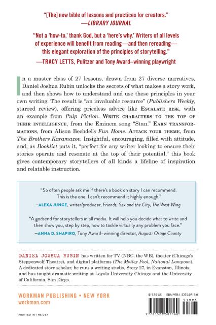 A master class of 27 lessons, drawn from 27 diverse narratives, for novelists, storytellers, filmmakers, graphic designers, and more. Author Daniel Joshua Rubin unlocks the secrets of what makes a story work, and then shows how to understand and use these principles in your own writing. The result is “an invaluable resource” (Publishers Weekly, starred review), offering priceless advice like escalate risk, with an example from Pulp Fiction. Write characters to the top of their intelligence, from the Eminem song “Stan.” Earn transformations, from Alison Bechdel’s Fun Home. Attack your theme, from The Brothers Karamazov. Insightful, encouraging, filled with attitude, and, as Booklist puts it, “perfect for any writer looking to ensure their stories operate and resonate at the top of their potential,” this book gives contemporary storytellers of all kinds a lifeline of inspiration and relatable instruction.