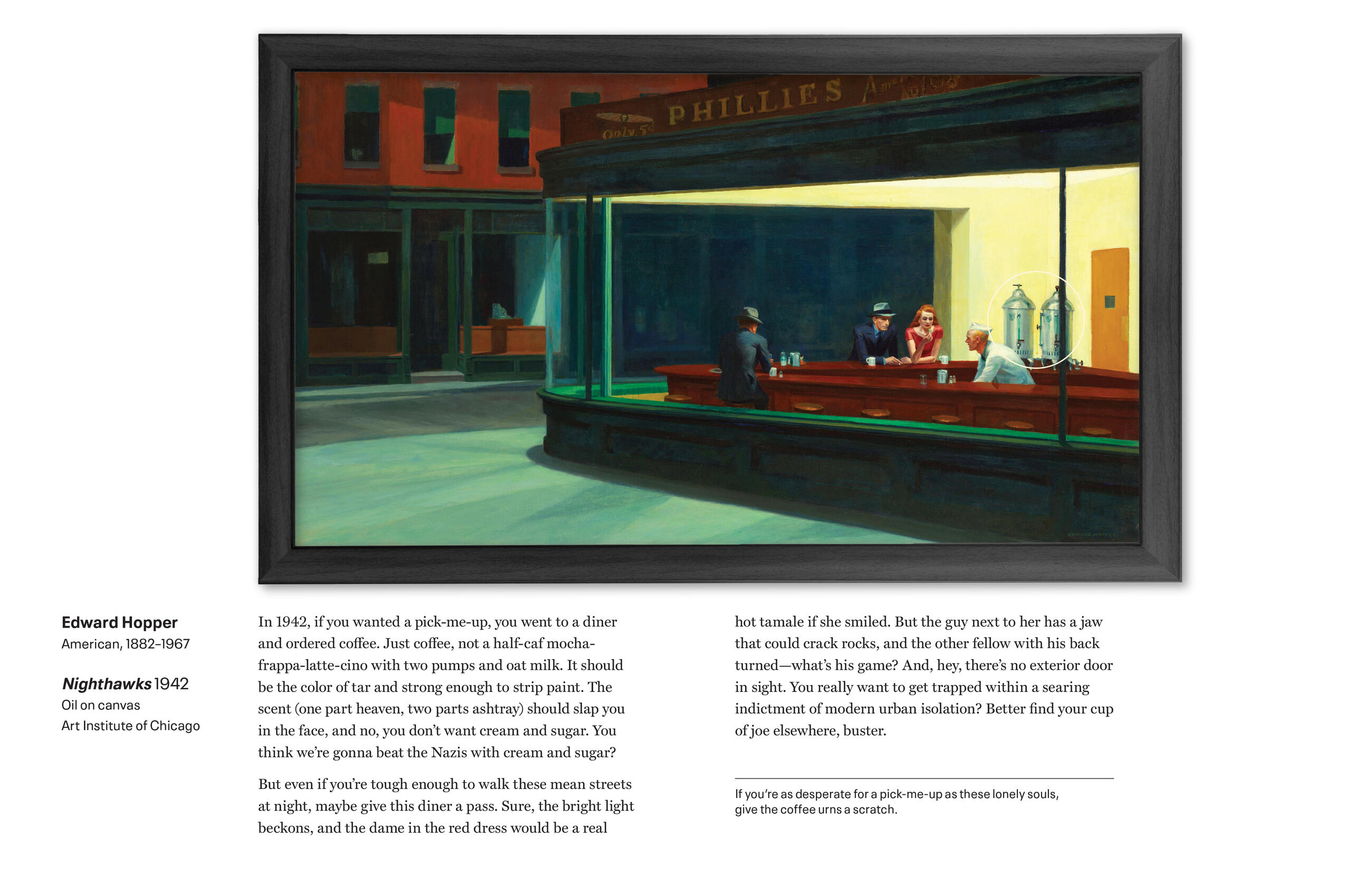 Smell the robust chianti in Caravaggio’s Bacchus. The fishy sea air of Great Wave off Kanagawa. Stale diner coffee in Edward Hopper’s Night Hawks—and much more!