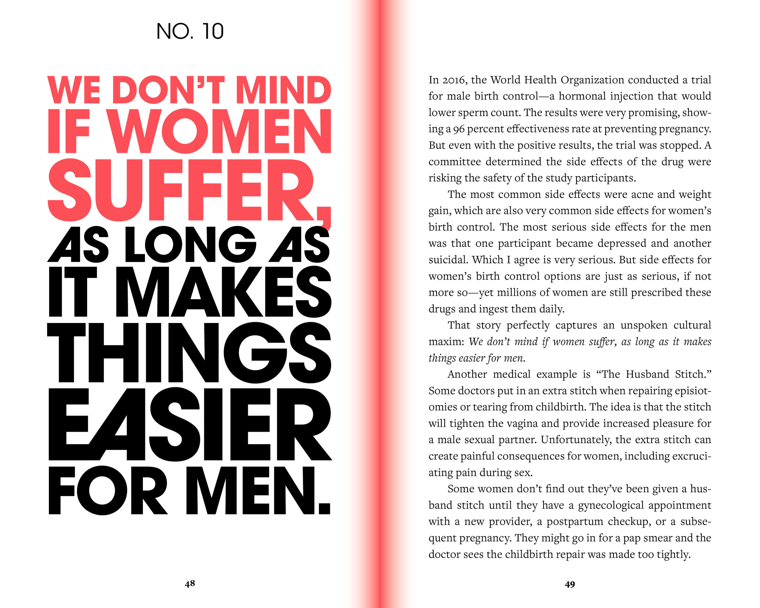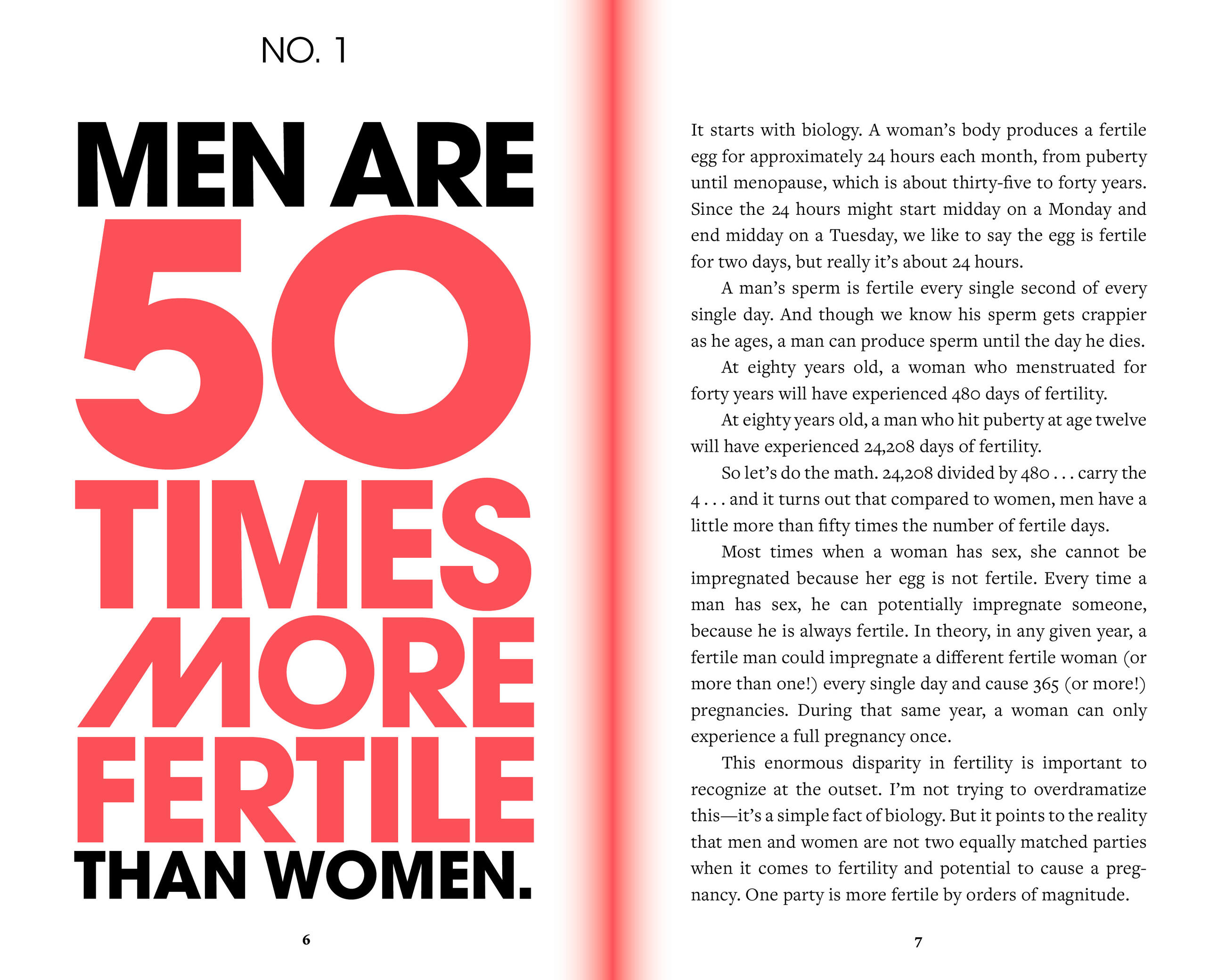 Highly readable, accessible, funny, and unflinching, Blair builds her argument by walking readers through the basics of fertility (men are 50 times more fertile than women), the unfair burden placed on women when it comes to preventing pregnancy (90% of the birth control market is for women), the wrongheaded stigmas around birth control for men (condoms make sex less pleasurable, vasectomies are scary and emasculating), and the counterintuitive reality that men, who are fertile 100% of the time, take little to no responsibility for preventing pregnancy.
