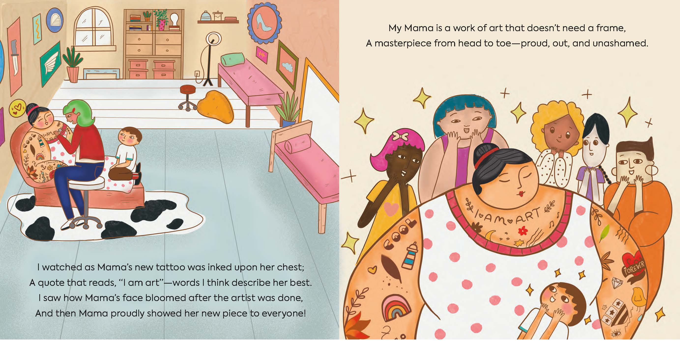 “As the often community-focused illustrations nod to famous works of art… the work celebrates the autonomy and ritual that tattoos represent for one parent who is regarded as nothing short of ‘a masterpiece.’”Publishers Weekly
