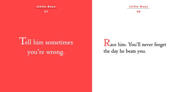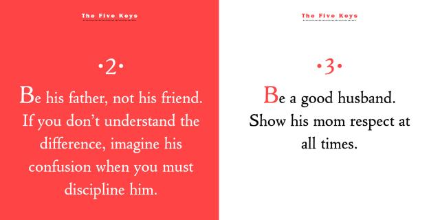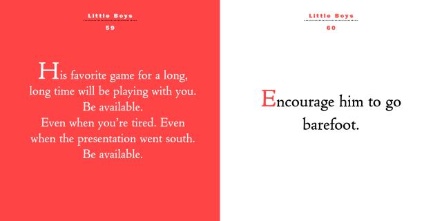 Freshly updated, the book begins with the Five Keys of Parenting, a guide to navigating the extraordinary, even if sometimes exasperating, journey of parenthood. It’s filled with the importance of nurturing responsibility: Teach him that the world will judge him by his actions, not his intentions. Fun stuff: Have tea with him in the afternoons. Serve cookies. And when he’s ready to go: Hug him fiercely.