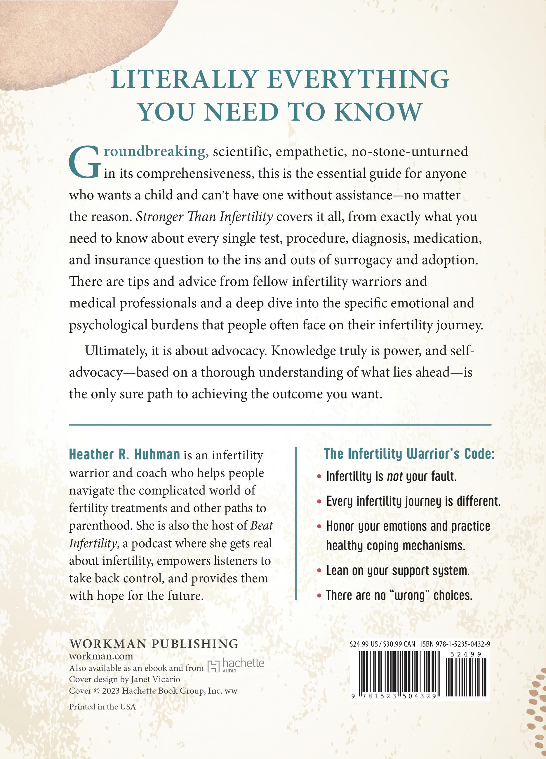 Author Heather Huhman guides readers through every stage of the process—from knowing when to seek medical advice to parenting after infertility, and everything in between. There’s the medical nitty gritty: getting a diagnosis (or not); selecting a fertility clinic that’s right for you; understanding IUI and IVF and genetic testing; a comprehensive list of medications and their side effects, and much more. There are emotional high and lows: staying hopeful while managing grief and depression, maintaining and strengthening your relationship, and navigating religious and ethical concerns. And then there is the practical and often complicated questions around affording treatments, dealing with your workplace (including the military), and everything you need to know about insurance and fertility treatments.Stronger Than Infertility breaks down complicated clinical information and expert medical advice from top specialists in the field. The book includes first-person stories and hard-won advice from women who have been down this long and often painful road (Huhman included) and offers a clear-eyed look at the emotional and psychological landmines that come with the journey. The result is a book that inspires as much as it educates and is a much-needed source of support and inspiration for readers hungry for understanding and hope.