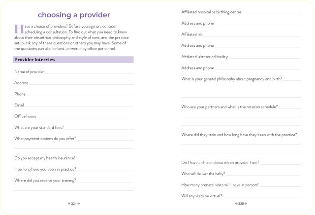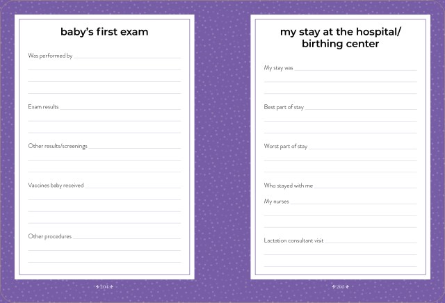 An all-in-one write-in book, filled with prompts, it works as a journal and daily diary to record all those memorable moments, from that positive pregnancy test to those precious ultrasounds, first kick to first contraction to first cuddle. It’s also an organizer, compact enough to toss in your bag, to keep track of provider visits, questions you want to ask the doctor, shopping lists, medications, birthing plans, and so much more. And, finally, it’s a cherished place to write down everything you’ll want to remember about these extraordinary nine months and, after baby arrives, the highs and lows of your “fourth trimester.”