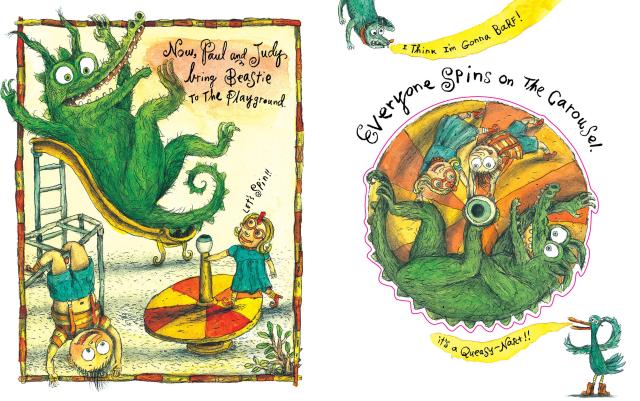 Written and illustrated by Henrik Drescher, Love the Beastie picks up where his irresistibly offbeat Pat the Beastie left off. Now Paul and Judy really are best friends with Beastie, and treat him with the love and respect he deserves. They go to the playground and spin on the carousel—don’t throw up! Brush Beastie’s gunky teeth (Gross!), and help Beastie play dress-up (ha, look at Beastie’s funny clothes). Then, at the end of a long day, they all cuddle together in bed. Ahhh.