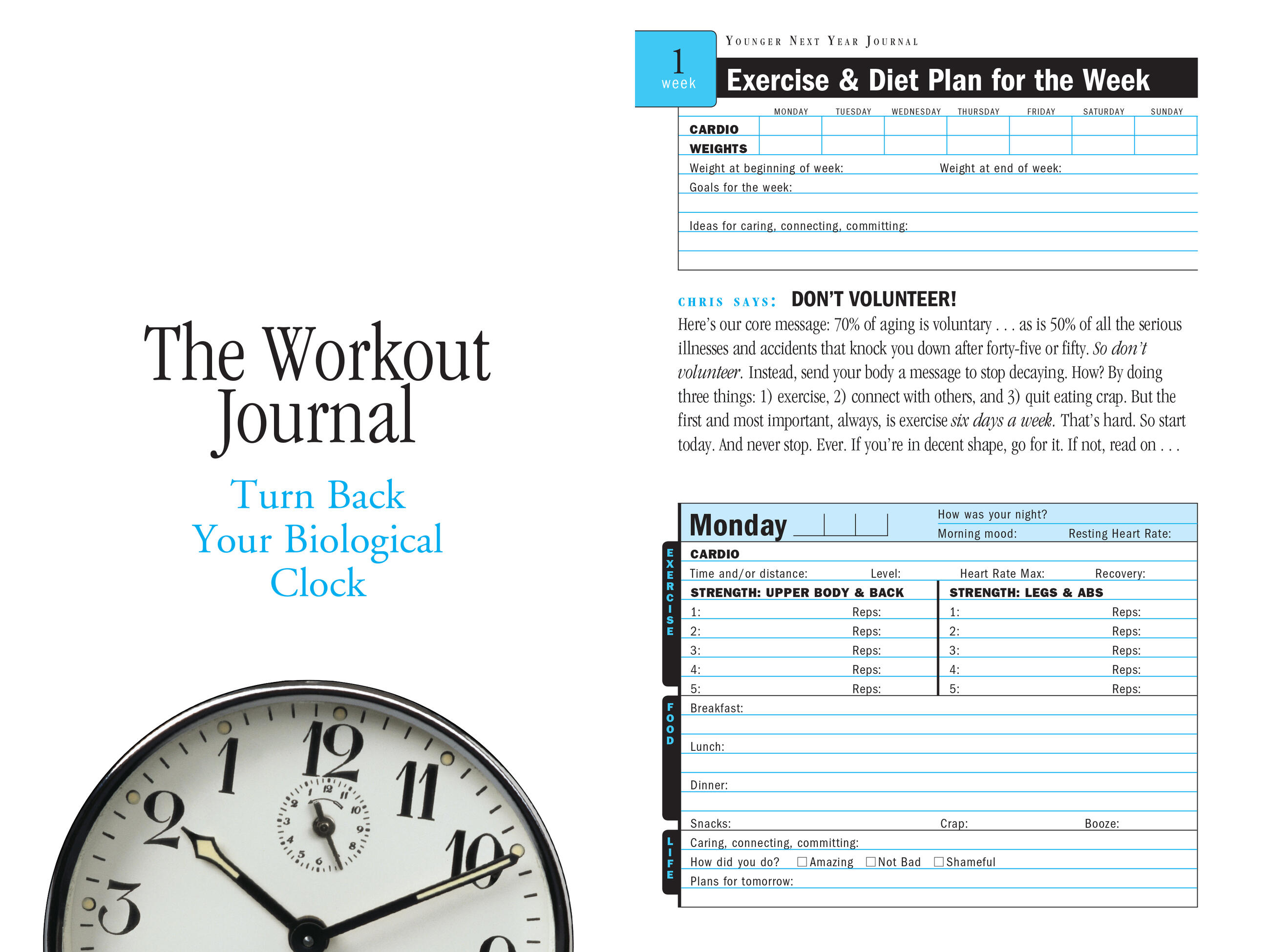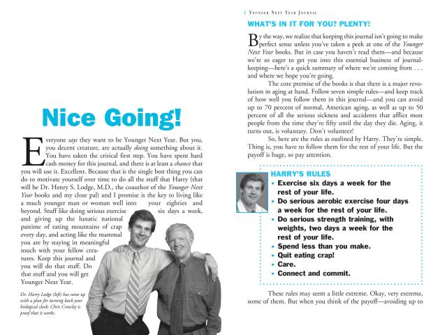 Now, to make that promise even easier to achieve, comes the Younger Next Year Journal. This is a needed recordkeeper for every trip to the gym, or better yet, bike vacation or ski trip. Beginning with a short introduction to working out the Younger Next Year way—how to use a heart rate monitor, why keeping a journal is important, how to look at exercise as your new job—here is a 224-page fill-in book with prompts that help you keep meticulous track of your workouts, your heart rate, your diet, how you feel, how you’ve reached out to others, and more. In addition, the journal is filled with motivational tips from Chris Crowley—don’t skimp on leg weights, treat yourself to the best equipment, how to get your Significant Other to work out with you—and medical Q&A’s from Dr. Henry Lodge, covering the science of aging, low-fat diets, and more.