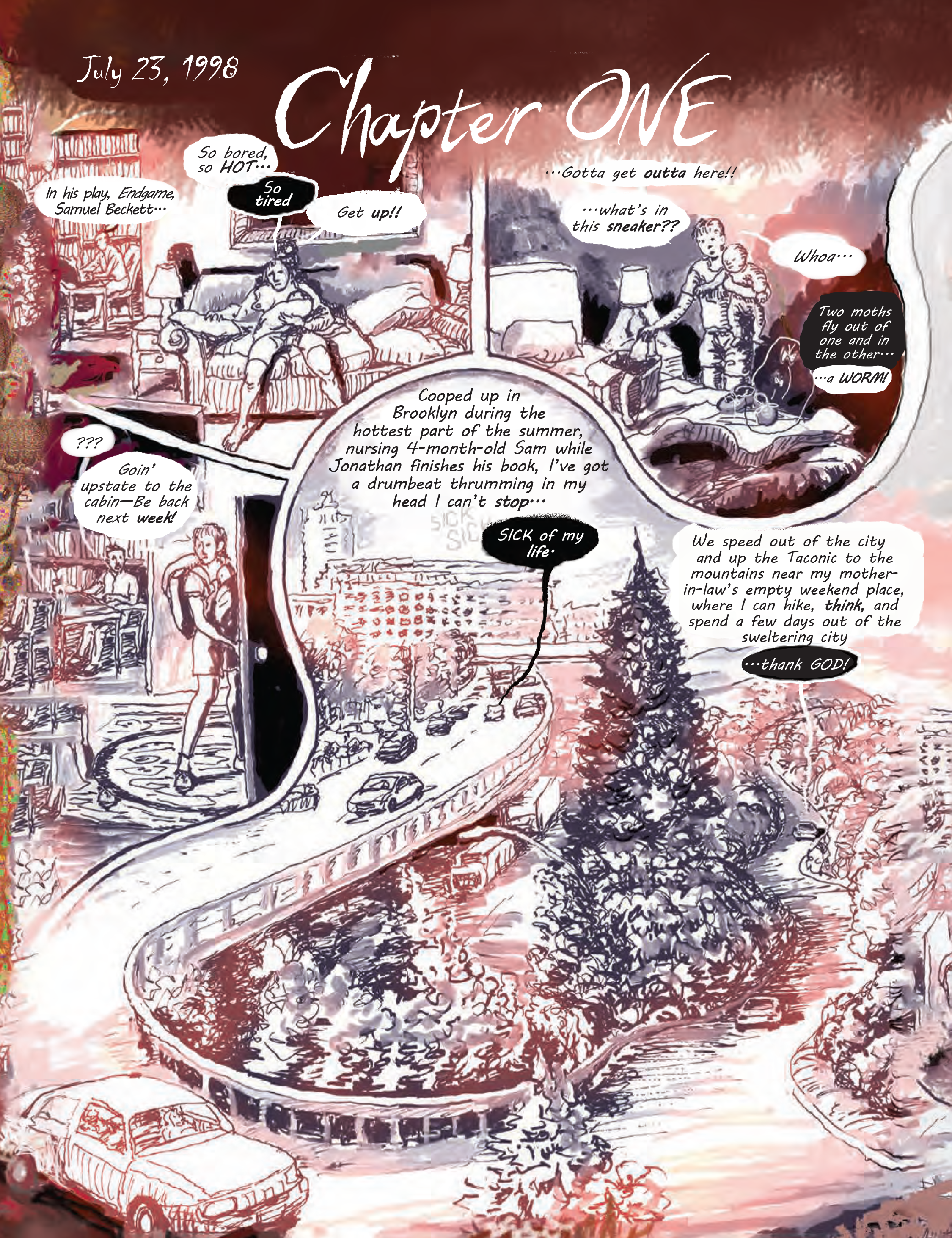 One summer day, a young artist with a newborn—sleep-deprived, desperate to escape her hot, cramped apartment and her oblivious husband—sets off on a hike in the country with her baby boy, Sam, strapped to her front and her senses fully attuned to the colors, the sounds, and the flora and fauna in the woods around her. During her journey, Julie reflects on her childhood, her parents, her marriage, and her path to becoming a painter. Her memories soon merge with the imaginative pictorial worlds she invents in her work, creating a glorious and perturbing narrative.