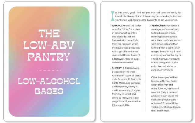 Here are 50 cards that help you set up your low-ABV bar and show you how to create 40 low- and no-alcohol drinks that are perfect for enjoying everyday and special occasions alike. Using beer, wine, cider, sake, sherry, and vermouth, plus a variety of amari and other liqueurs, the recipes come from bartenders all over the country who are passionate about creating craft cocktails.