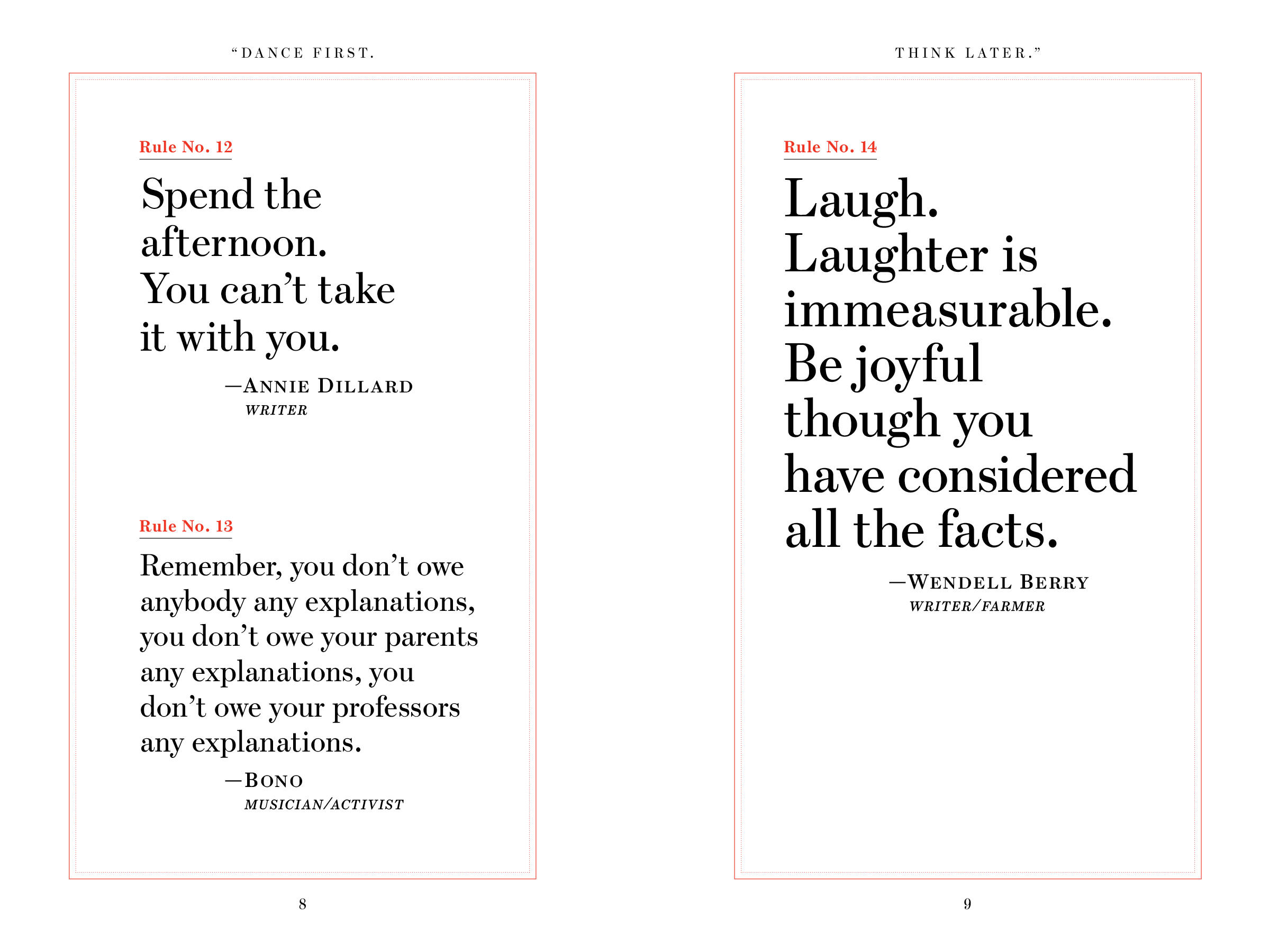 Created by Kathryn and Ross Petras, connoisseurs of quotes, whose books and calendars have over 56 million copies in print, “Dance First. Think Later.” is a collection of the greatest life wisdom from an unexpected group of speakers, doers, and thinkers. There are 618 rules to live by—funny, sly, declarative, thoughtful, offhanded, clever, and always profound: