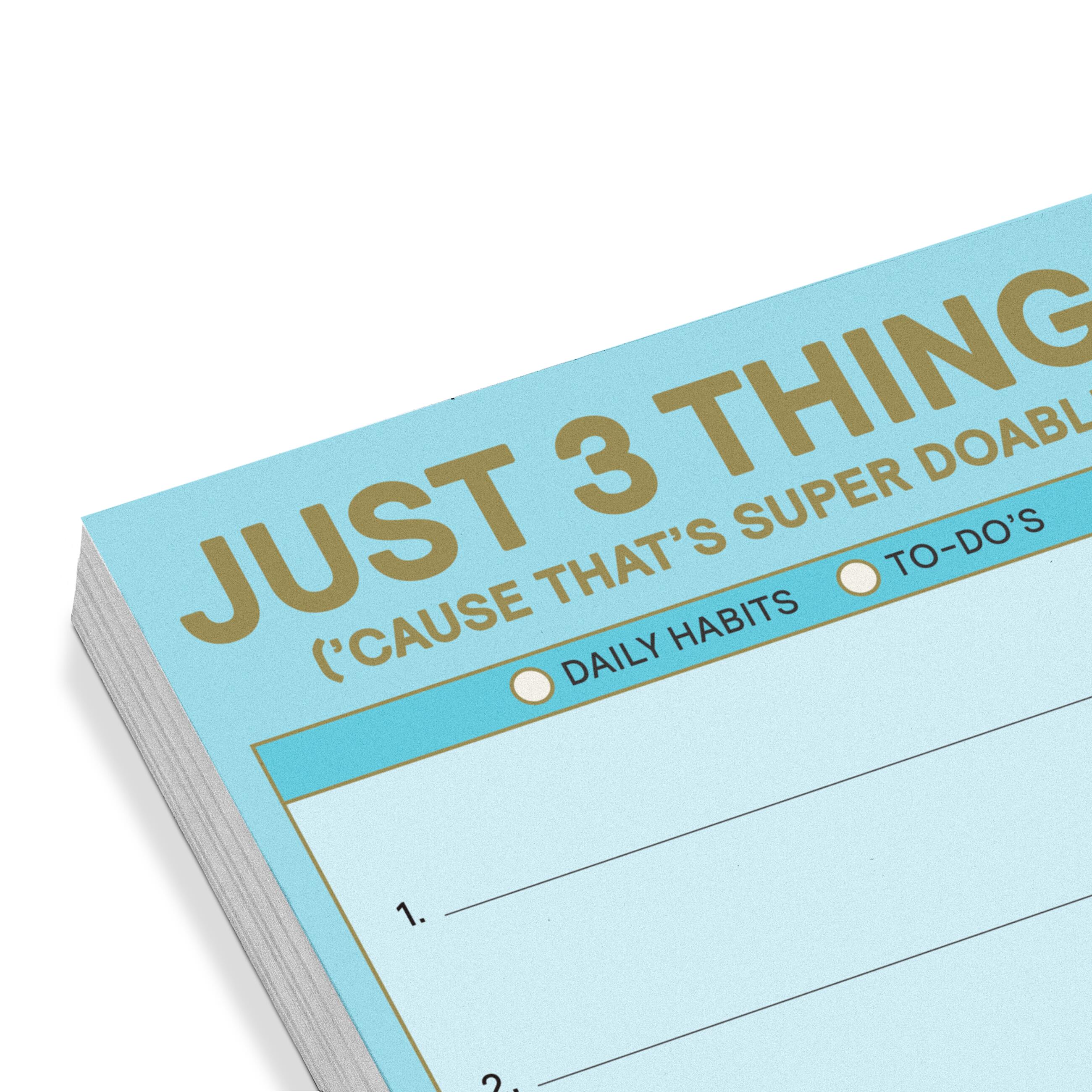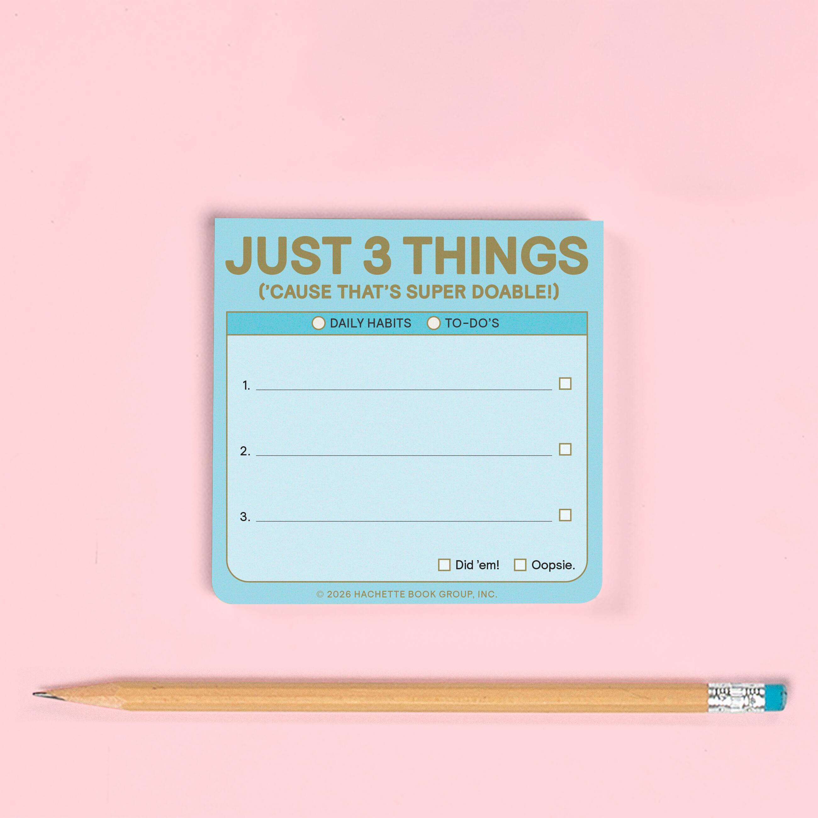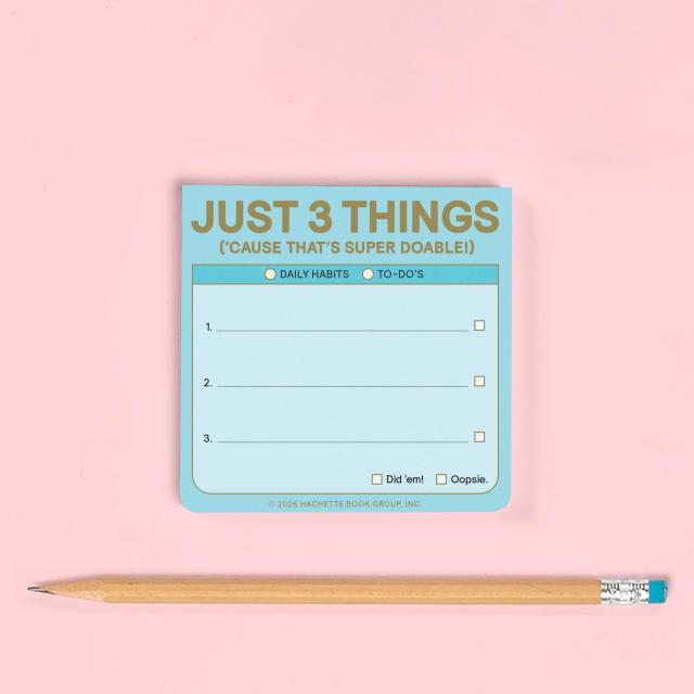 The Just 3 Things sticky note is here to help people maintain or develop three habits a day—in a friendly, portable, easy-peasy format. With 100 adhesive sheets, it’s perfect for jotting down daily goals and short reminders to self that are sure to stick!