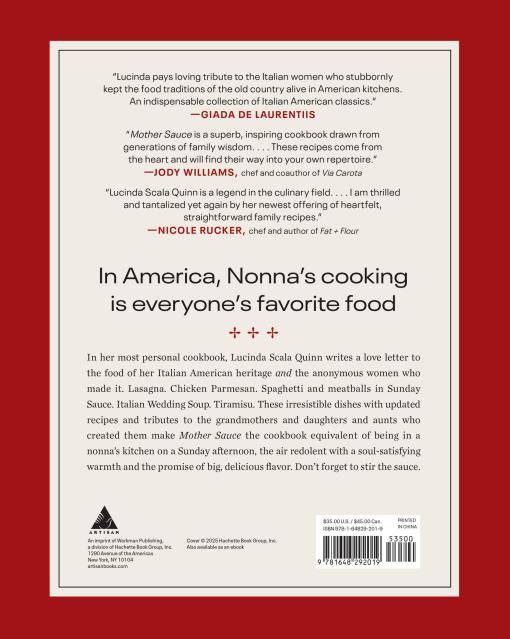 “While there may be other cookbooks preserving Italian-American cooking, no one gets to the heart of this storied cuisine with more passion and perspective than Lucinda Scala Quinn. Using her own very personal family history, spanning five generations, countless relatives and dishes, she puts into focus the creation and evolution of our country’s most beloved recipes. MOTHER SAUCE honors the hard-working, often unrecognized, immigrant women whose grit and gumption paved the way for every delicious swirl of pasta in Sunday gravy, meatball sub and cacciatore we have come to know and adore. With Lucinda's expert guidance and generous approach in the kitchen, these classics are sure to be passed down again and again.”Gail Simmons, Food Expert, TV Host and Author of BRINGING IT HOME