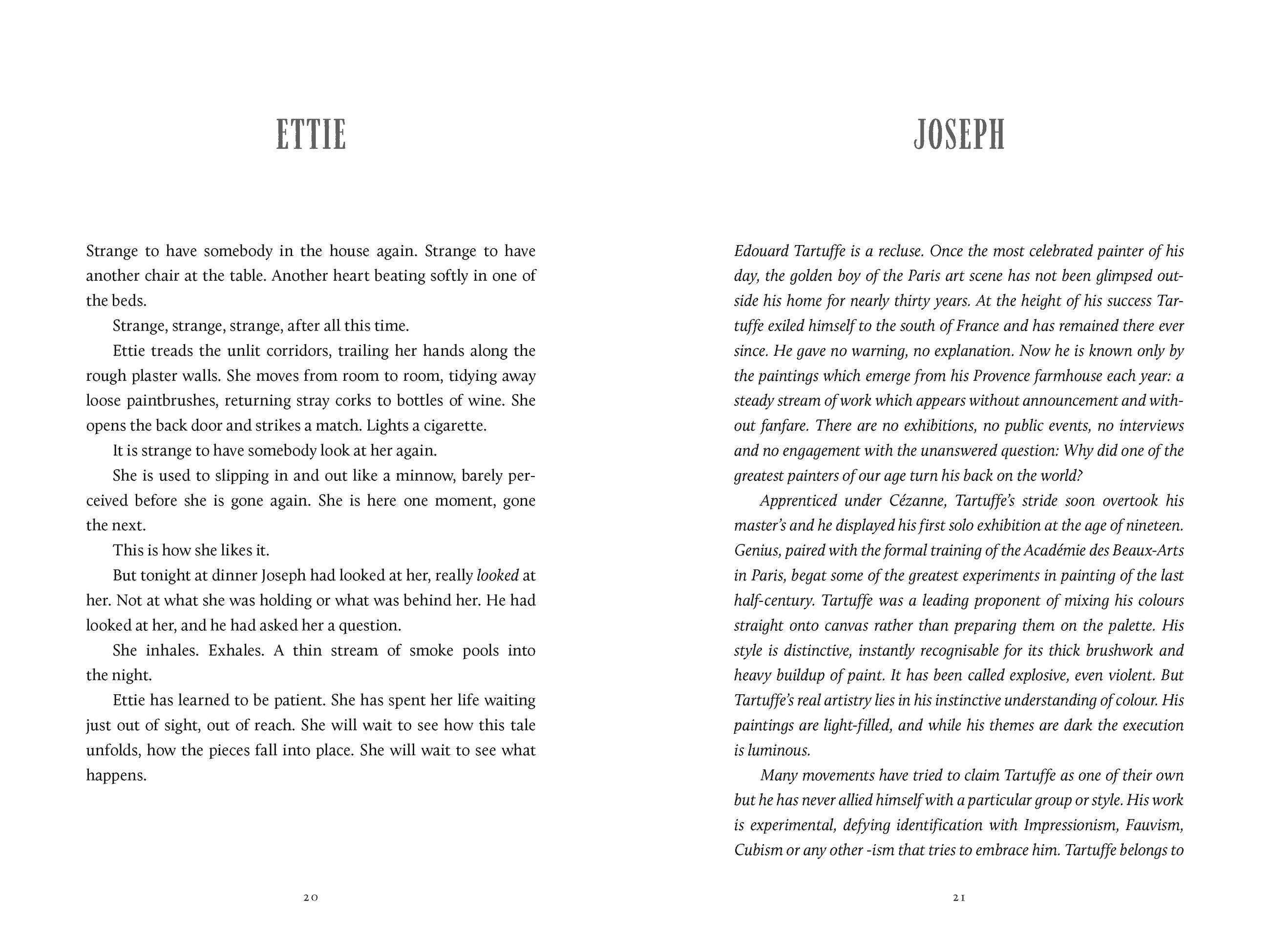 During a scorching summer in 1920s Provence, a young journalist, Joseph Adelaide, turns up at the farmhouse of reclusive artist Edouard Tartuffe, hoping to write an article about him. There, he meets Ettie, Tartuffe’s niece, who appears to do everything for her uncle—from cooking and cleaning to catering to his maniacal moods. Joseph is beguiled by where he finds himself, not just by this foreign place or Tartuffe himself, but by Ettie, who watches everything so quietly from the periphery. Both Joseph and Ettie carry scars from their pasts and it’s as they get to know each other that they start to lay bare those scars to themselves and to each other.