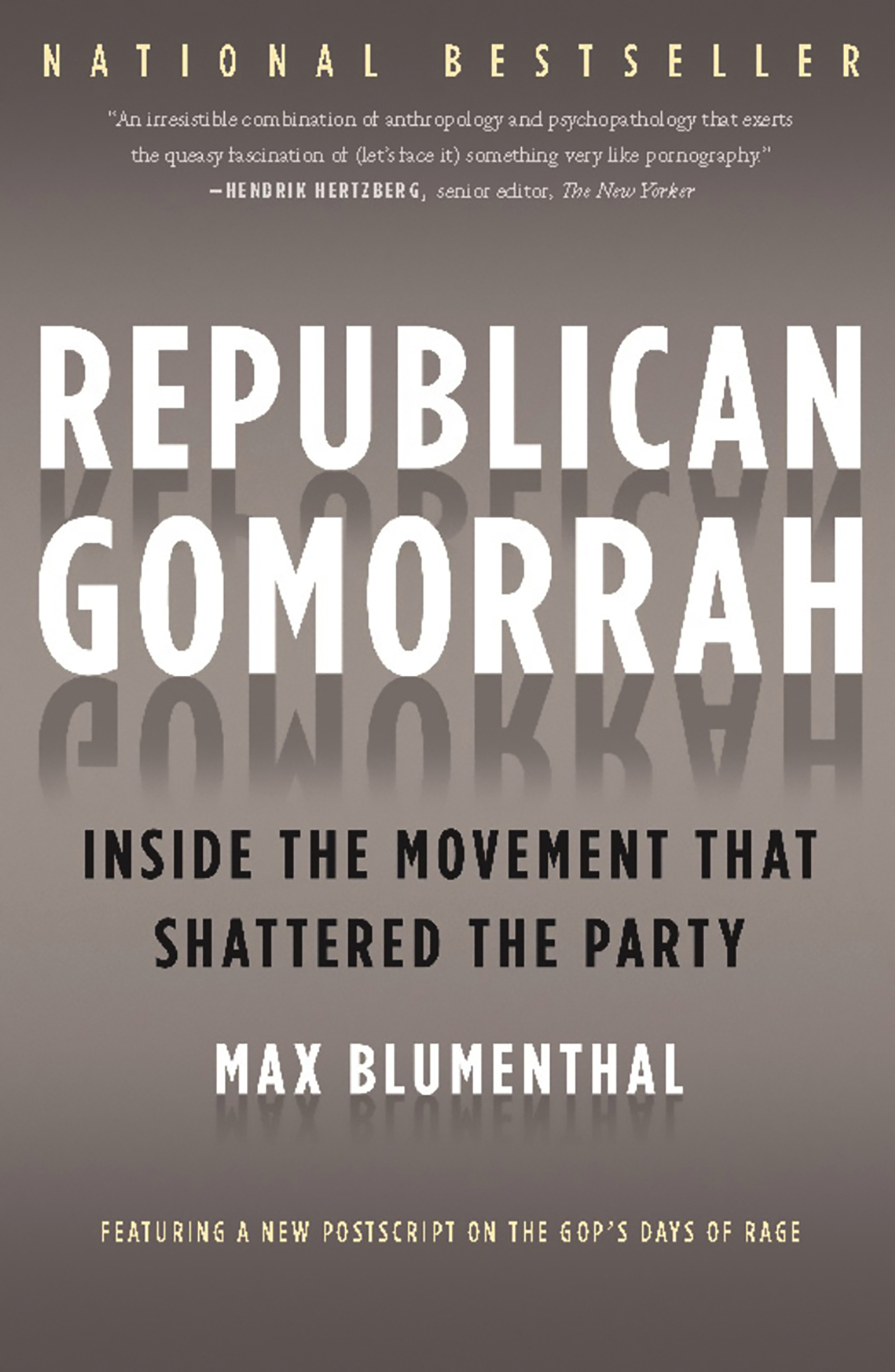 "With scarcely more than a pith helmet, a notebook, and a tattered copy of Escape from Freedom, Erich Fromm’s great study of authoritarian psychology, the dauntless Max Blumenthal set forth years ago to explore the dank forests of American Christianism. Now he has returned to civilization, bringing back a fine collection of shrunken heads and a riveting account of a religio-political subculture that’s even weirder than you thought it was. Republican Gomorrah is an irresistable combination of anthropology and psychopathology that exerts the queasy fascination of (let’s face it) something very like pornography."Rick Perlstein,