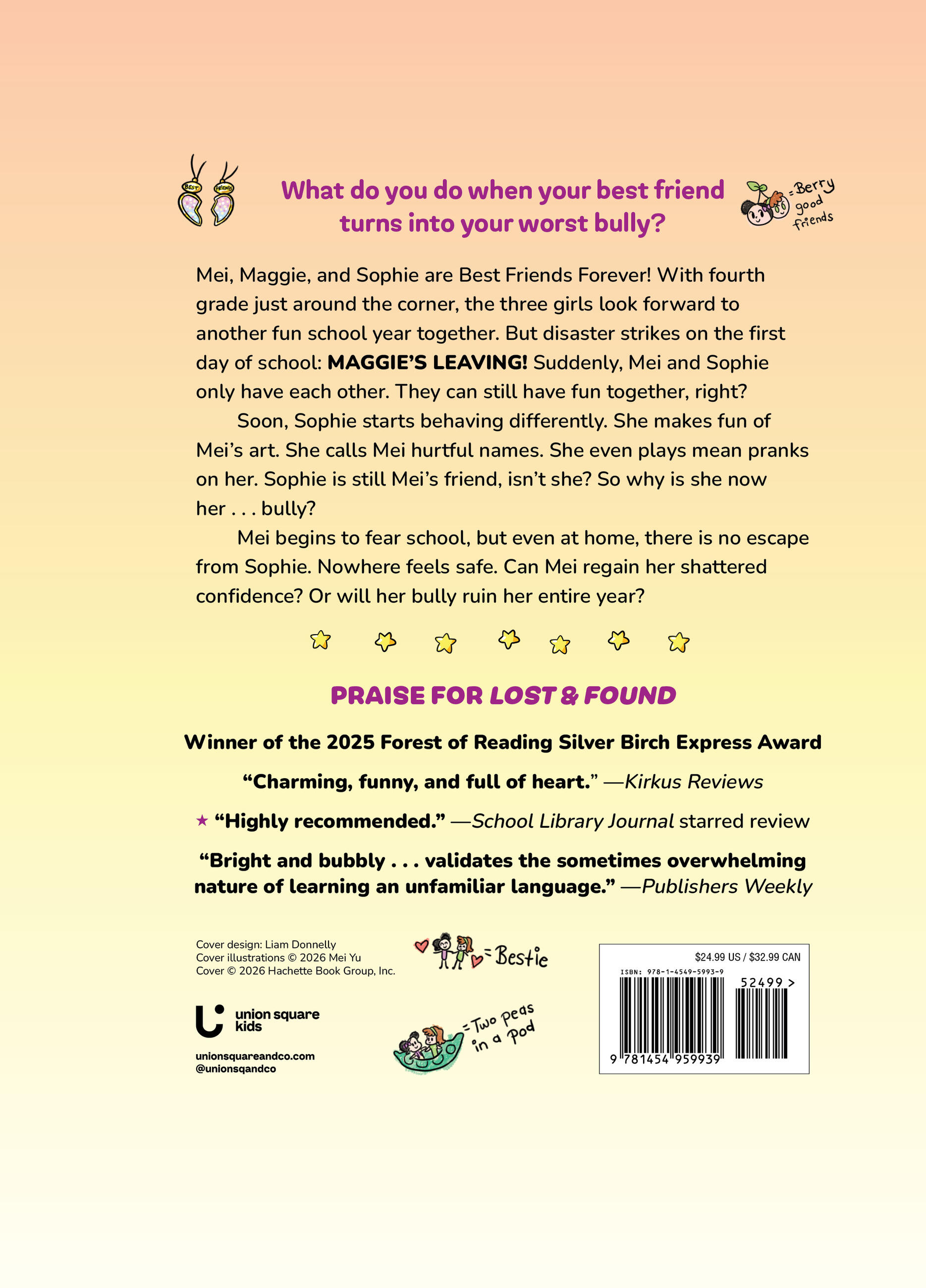 With fourth grade just around the corner, the three girls look forward to another fun school year together. But disaster strikes on the first day of school: MAGGIE’S LEAVING!! Suddenly, Mei and Sophie only have each other. They can still have fun together, right?
