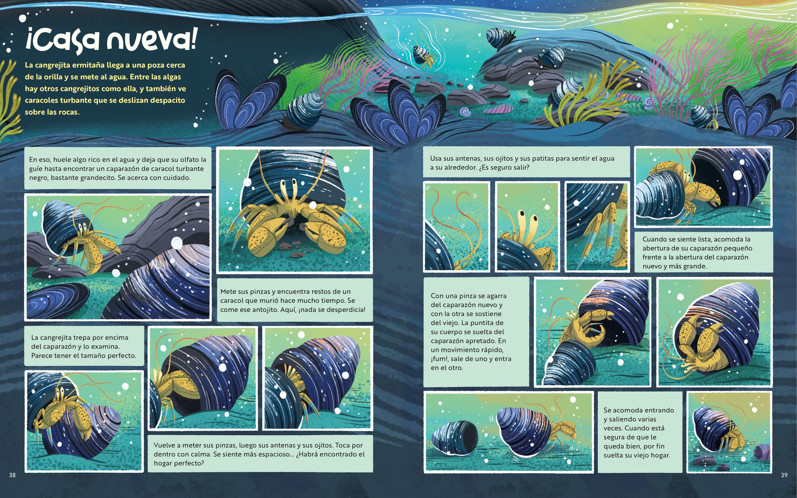 En una gran poza de marea de la costa central de California, lo que a simple vista parece solo un grupo de rocas se llena de color y emoción cuando una cangrejita ermitaña comienza la búsqueda de una casa más grande. A lo largo del ciclo de las mareas, deberá enfrentarse a condiciones extremas: olas que golpean con fuerza, depredadores hambrientos y un vecindario lleno de criaturas sorprendentes, todo mientras intenta encontrar su nuevo hogar. A través de hermosas ilustraciones y fotografías reales, los lectores aprenderán sobre las adaptaciones de muchas especies, por qué ocurren las mareas, cómo funciona la red alimentaria de las pozas de marea y mucho más.