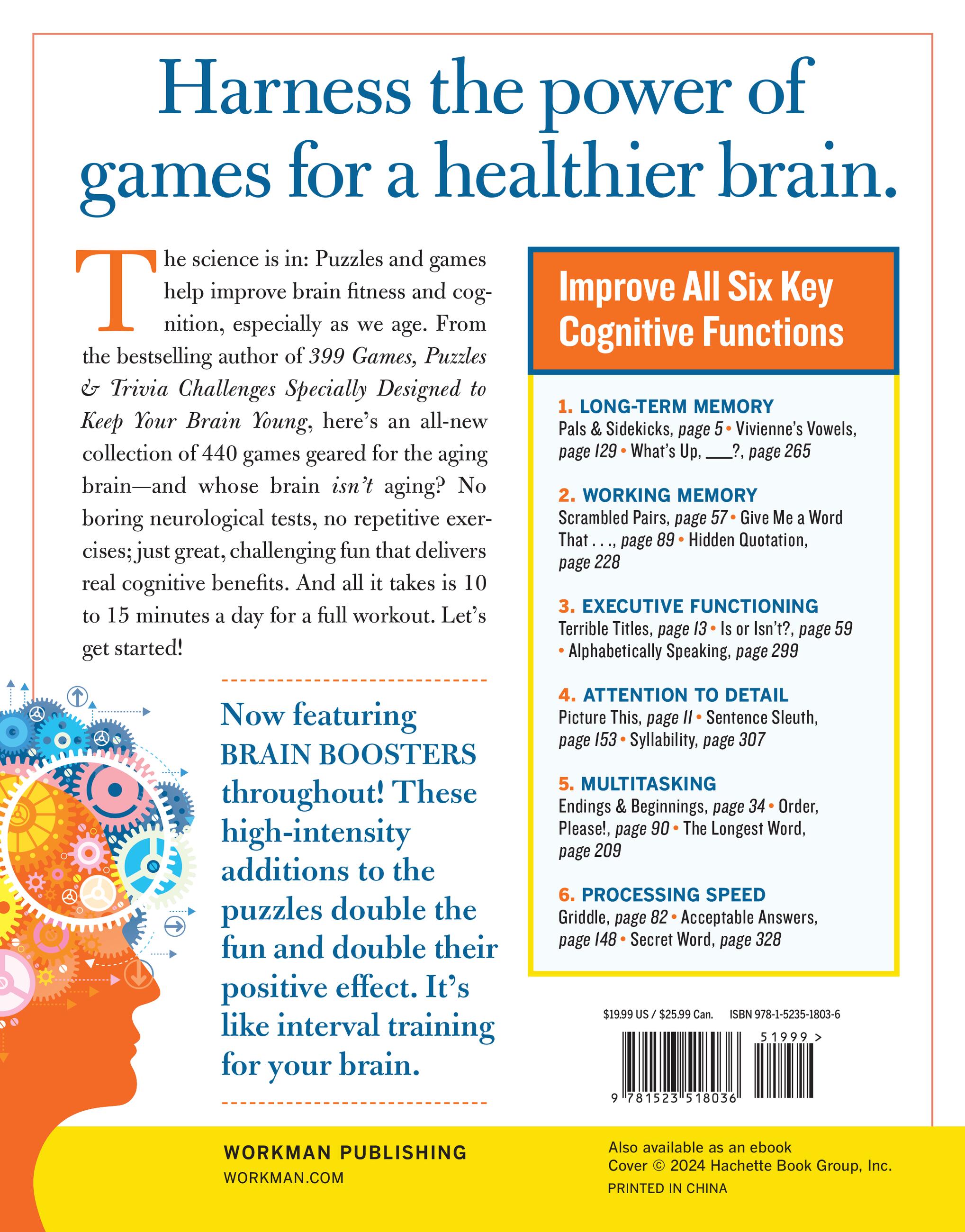 Achieving and maintaining a higher level of mental fitness every day can be surprisingly fun—and to your brain, it’s healthy exercise. In this next exciting entry in her bestselling games series (including 399 Games, Puzzle & Trivia Challenges Designed to Keep Your Brain Young with 547,000 in print), Nancy Linde offers a brand-new collection of puzzles, trivia challenges, brainteasers, and word games that are not only great fun to do but are specifically designed to give your brain the kind of workout that stimulates neurogenesis, the process that allows the brain to grow new cells. With each daily puzzle, cross-train your brain by targeting one of 6 key cognitive functions: Long-term memory, working memory, executive functioning, attention to detail, multitasking, and processing speed. And 75 Brain Boosters—a brand-new feature in this book—will build on the original puzzle and take your brain in a new direction.