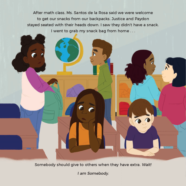 I Am Somebody takes the reader on a journey over the course of a day, as our main character notices various forms of neglect and injustice—from trash on the sidewalk and students butting in line waiting for the bus, to not sharing on the playground and bullying about food. In each instance, the young child remarks that SOMEBODY should do something to remedy the situation(s) until, eventually, they realize that they are the person that can effect change. This powerful story reminds us that every living thing is unique and should be treated with kindness and respect and that we are ALL “somebody.”