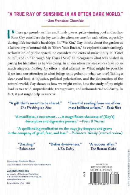 “He is many things—an award-winning essayist and poet, but also a community gardener and former basketball coach—and these roles are the details that till the soil of what blooms in his writing. Gay exudes a generosity of spirit. It’s true in person and on the page, evidenced in his newest collection of essays, Inciting Joy.”The Rumpus (November Book Club Selection)