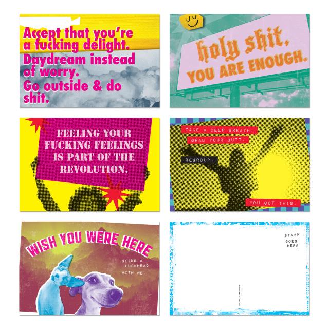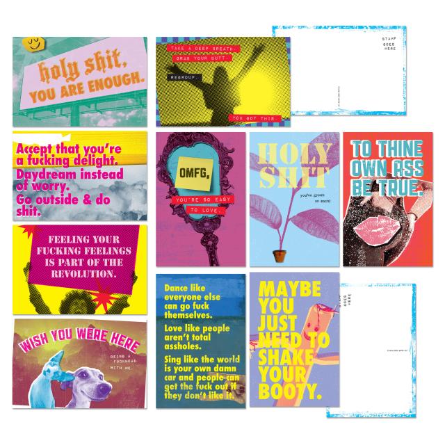 Send support and life-affirming profanity in the mail! These hilarious affirmation postcards make it fun & easy to remind your favorites they are incredibly worthy & cared for. These spiritual messages might also make ’em chuckle so hard they poop their pants, which will be a story they can tell again & again to spread joy across the land.