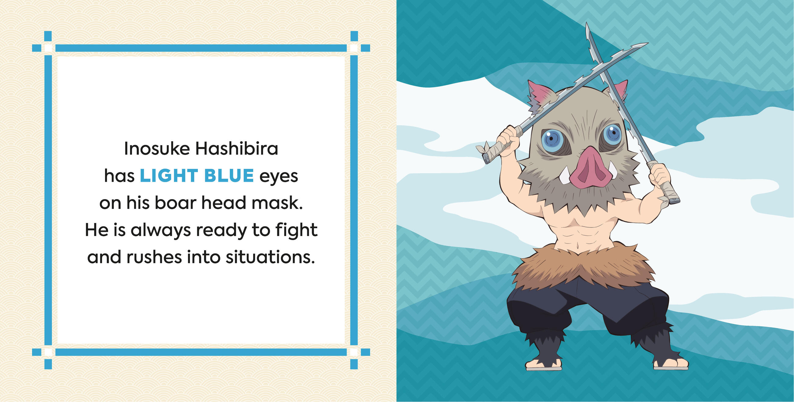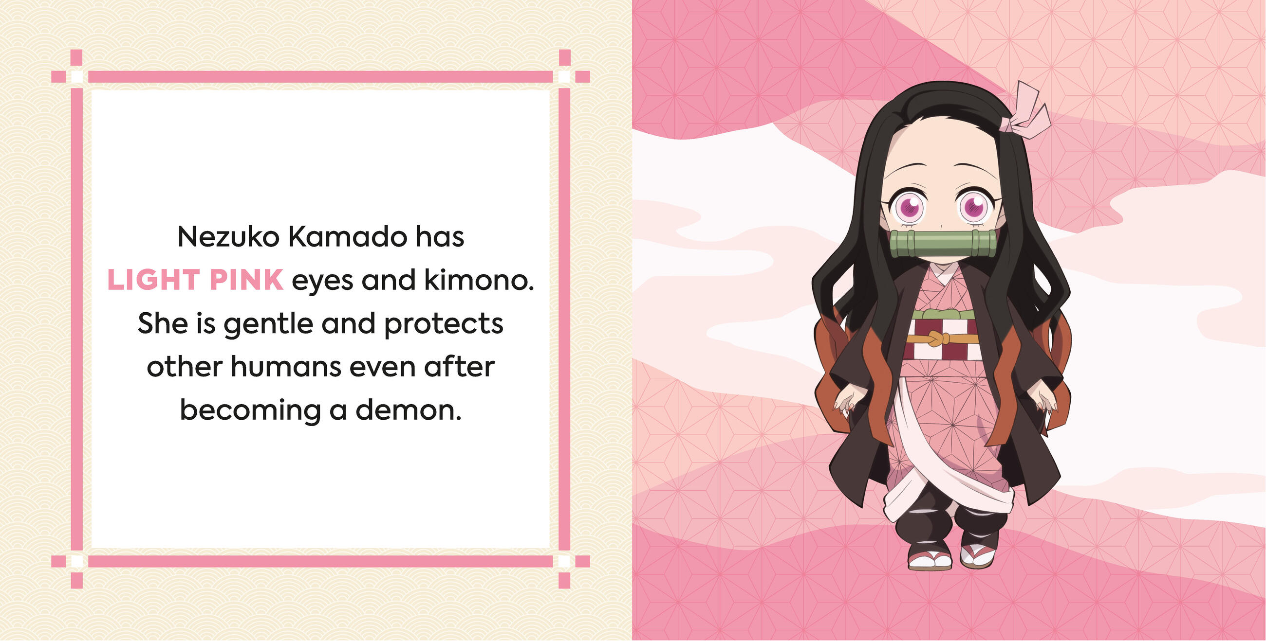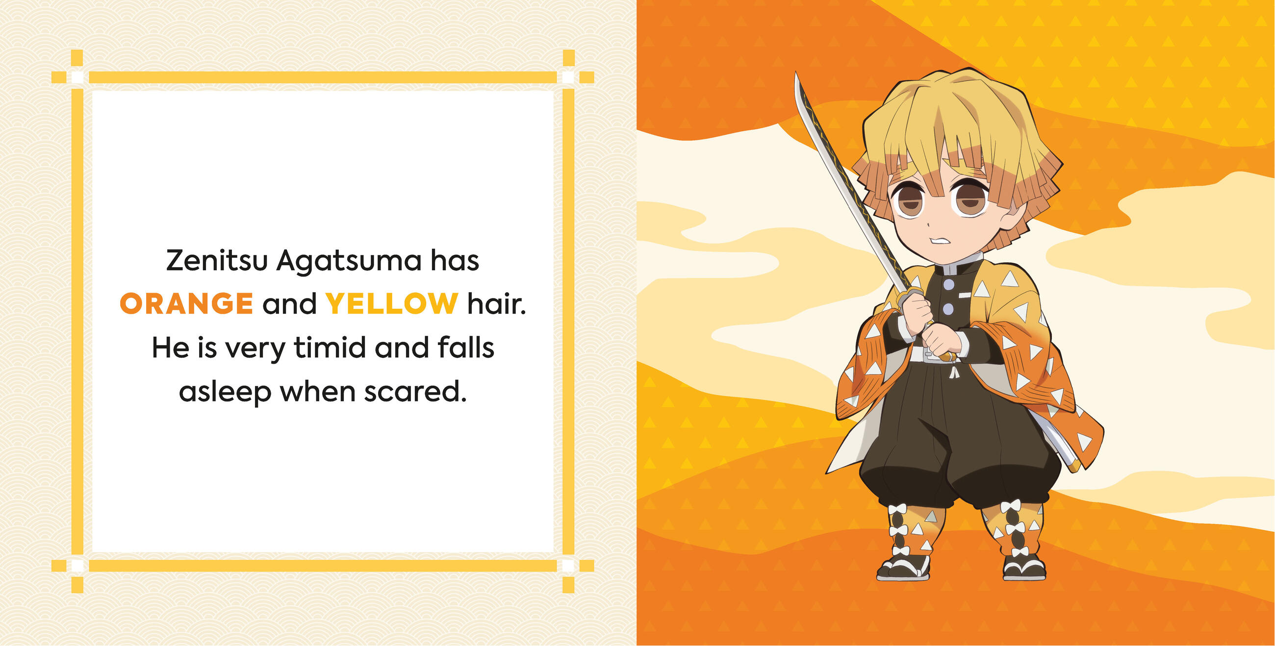 The Demon Slayers Corp members and the Hashira are very colorful. Tanjiro, who is kindhearted, wears a green haori. His sister, Nezuko, wears a pink kimono while she protects humans. Timid Zenitsu has orange and yellow hair, while Inosuke’s light blue eyes shine through his wild board mask. Fans of the hit anime show Demon Slayer: Kimetsu no Yaiba will enjoy sharing their love of anime with little ones while teaching them basic colors and important character traits with their favorite members of the Demon Slayer Corps.