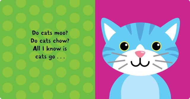 Do cats moo? Do cats chow? All I know is cats go MEOW! This novelty board book, with fun text and colorful illustrations, features adorable puppies, hamsters, and bunnies, as well as the cuddly title cat and other favorite pets. Kids will happily lift the flap on each big animal “mouth” to uncover what sound it makes. For a grand finale, all the animals appear together peering out from behind two gatefolds, so children can sneak a peek and squeak, chirp, sniff, and snuffle once again!