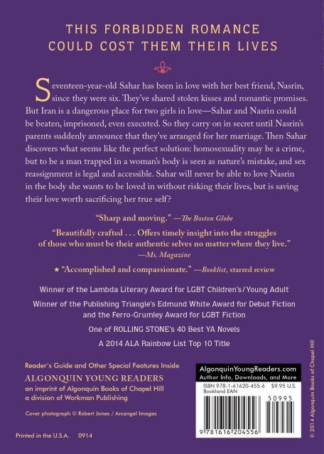 Seventeen-year-old Sahar has been in love with her best friend, Nasrin, since they were six. They’ve shared stolen kisses and romantic promises. But Iran is a dangerous place for two girls in love–Sahar and Nasrin could be beaten, imprisoned, even executed. So they carry on in secret until Nasrin’s parents suddenly announce that they’ve arranged for her marriage. Then Sahar discovers what seems like the perfect solution: homosexuality may be a crime, but to be a man trapped in a woman’s body is seen as nature’s mistake, and sex reassignment is legal and accessible. Sahar will never be able to love Nasrin in the body she wants to be loved in without risking their lives, but is saving their love worth sacrificing her true self?