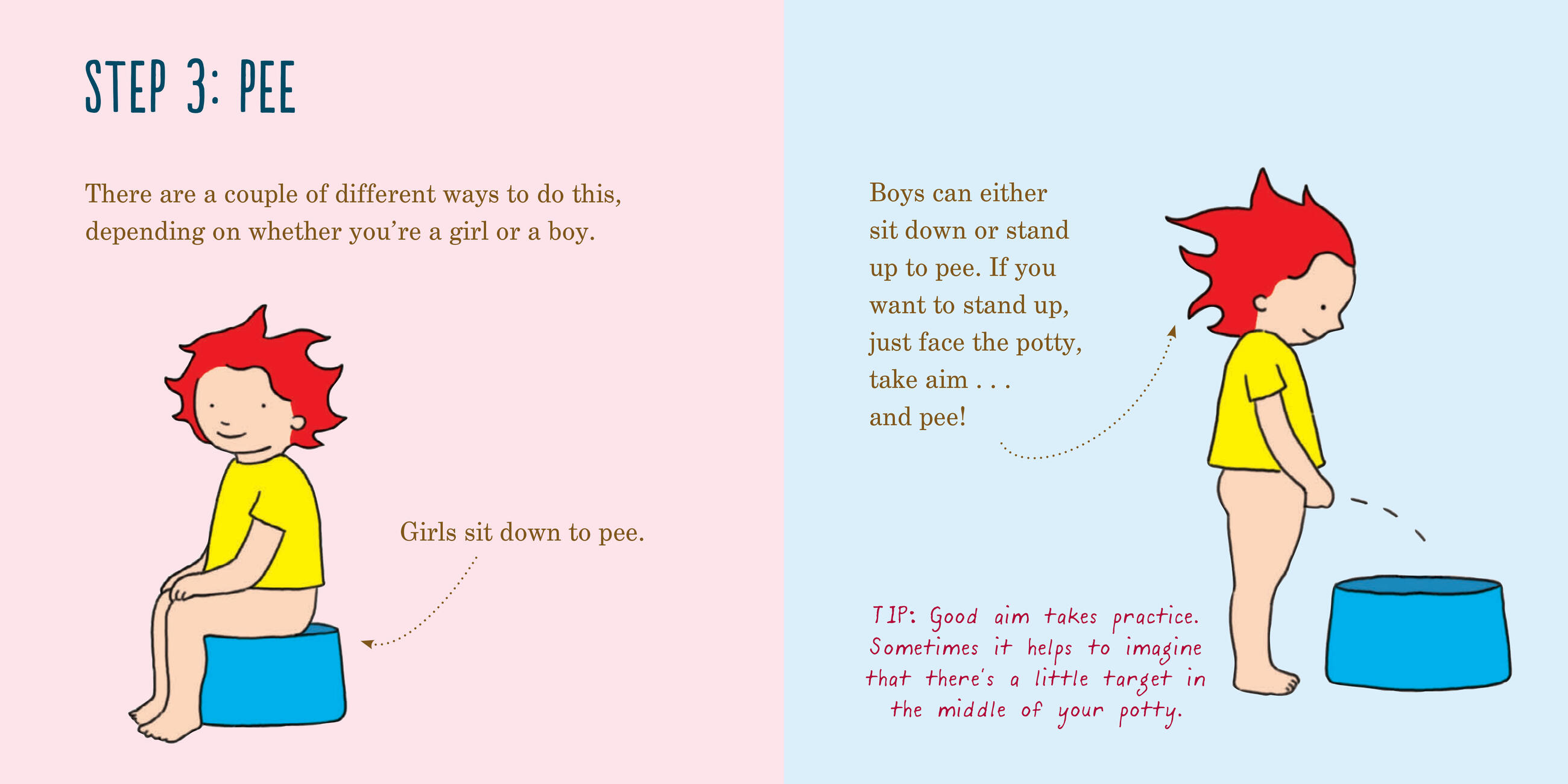 Written from the perspective of an eager and curious toddler (and, unlike other potty-training books, designed to teach both boys and girls), this charmingly illustrated book celebrates every successful trip to the bathroom with a “potty palooza” and stars an endearing and quirky cast of characters: potty hippos, who gather when you use too much toilet paper; space aliens, who zoom in to try to use your potty; a wild elephant; and the Poop Police, who issue Mom or Dad a ticket for sounding too silly when singing the “Potty Song.”