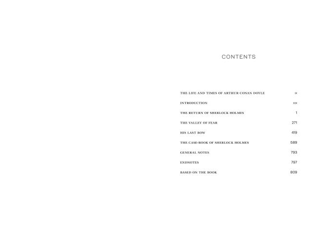 Included in this volume are the fourth and final Sherlock Holmes novel, The Valley of Fear, and the thirty-three stories comprising The Return of Sherlock Holmes, His Last Bow, and The Case-Book of Sherlock Holmes.