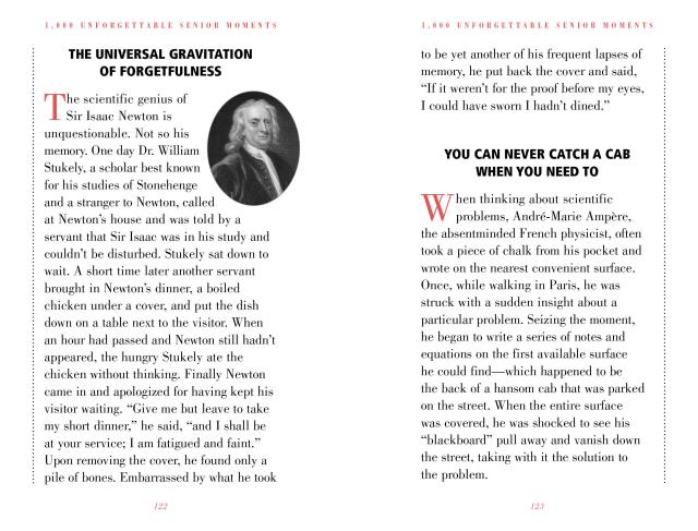 The president who left the nuclear launch codes in a suit at the dry cleaners. The novelist who put the orange juice outside and the kitten in the refrigerator. The Russian general who left home in full military dress . . . minus his pants. The famous sex goddess who blew the same line through 52 takes. And the rock star who no longer remembers 1975. Filled with classic lapses, gaffes, and mental bloopers, 1,000 Unforgettable Senior Moments is a fabulous and witty gift for anyone of a certain age. And now it is updated, revised with more than 20 percent new stories, and repackaged in two color, making it an even more vibrant, visually appealing, fresh, and compellingly readable book.