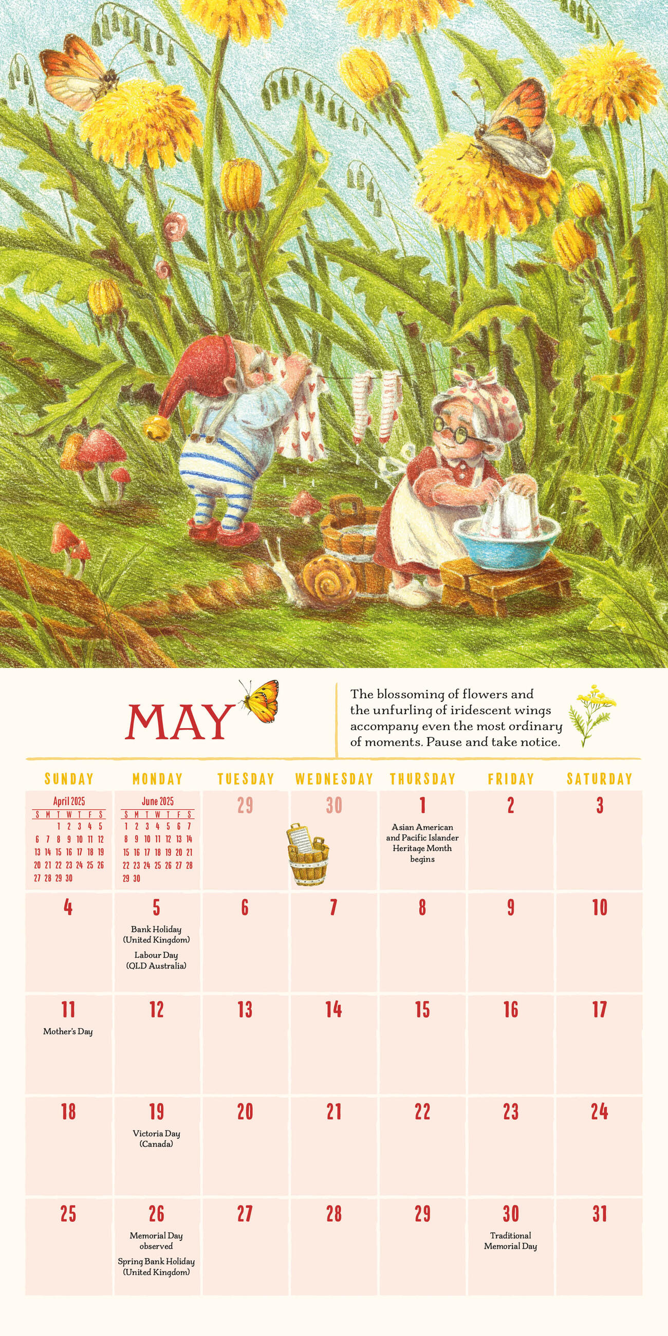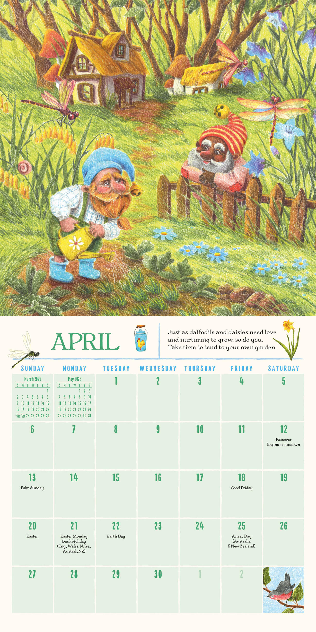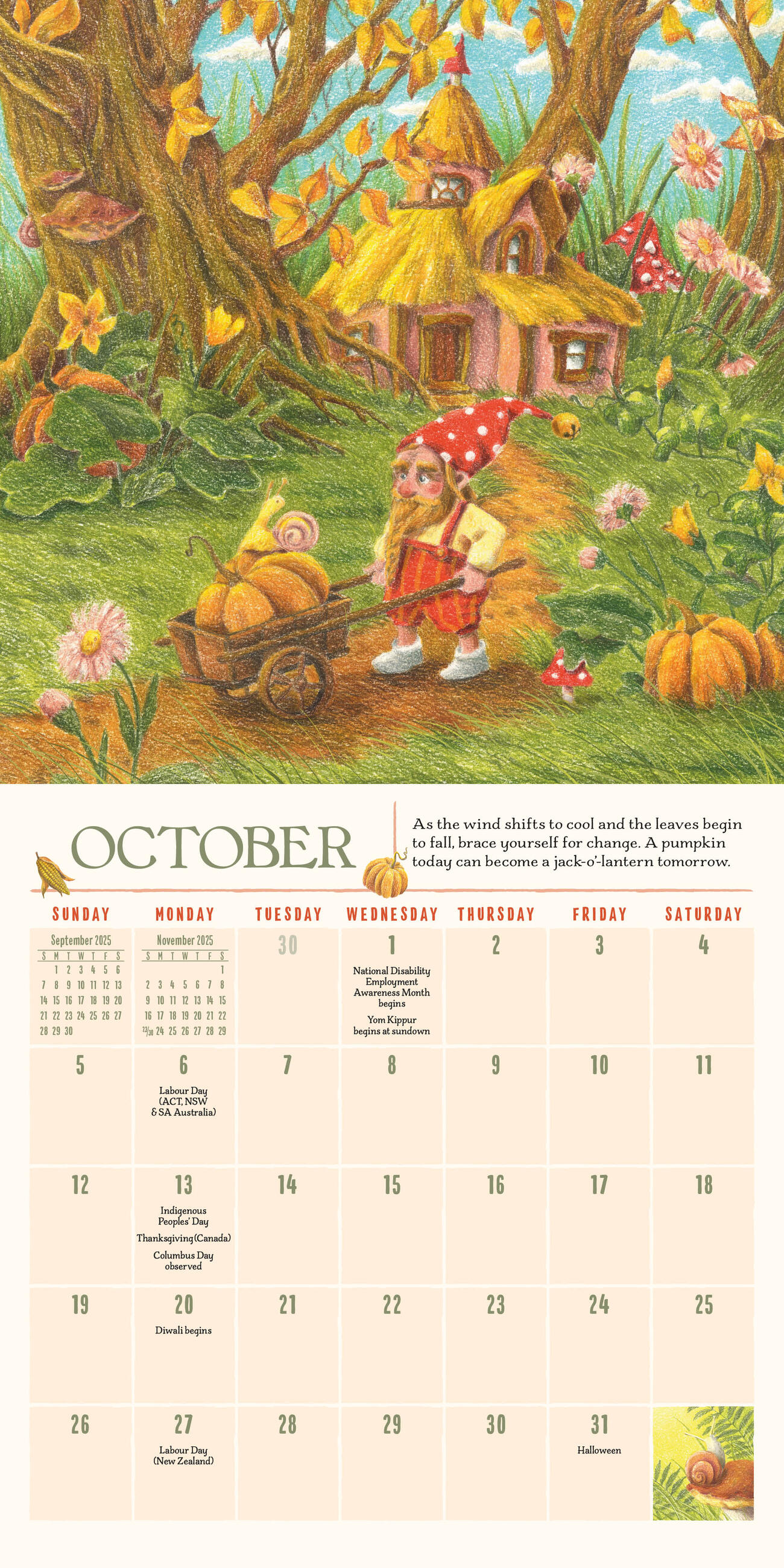 - GNOME SWEET GNOME: A tiny crew of gnomes brighten each month with woodland animals, mushrooms, and wildflowers, plus tidbits of gnome wisdom: Remember that a generous hand and kind smile can make someone else’s day.