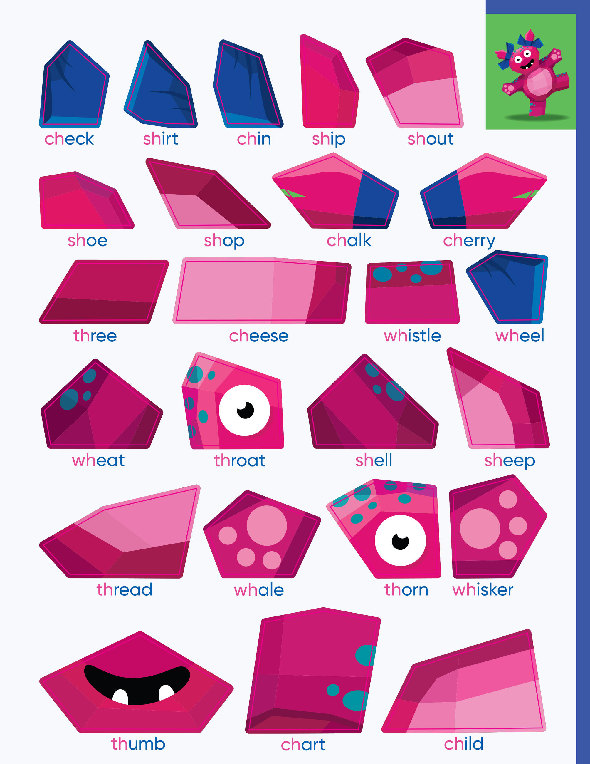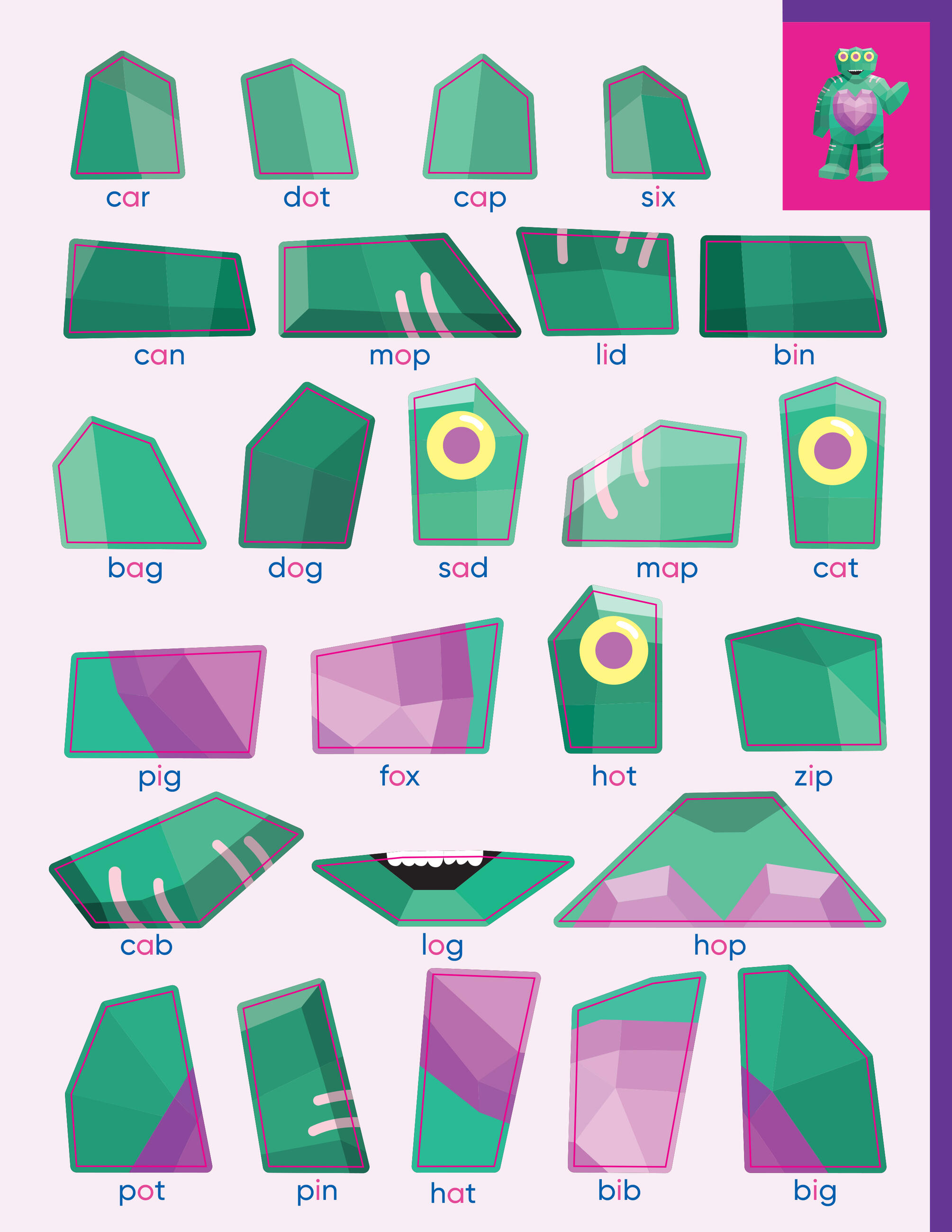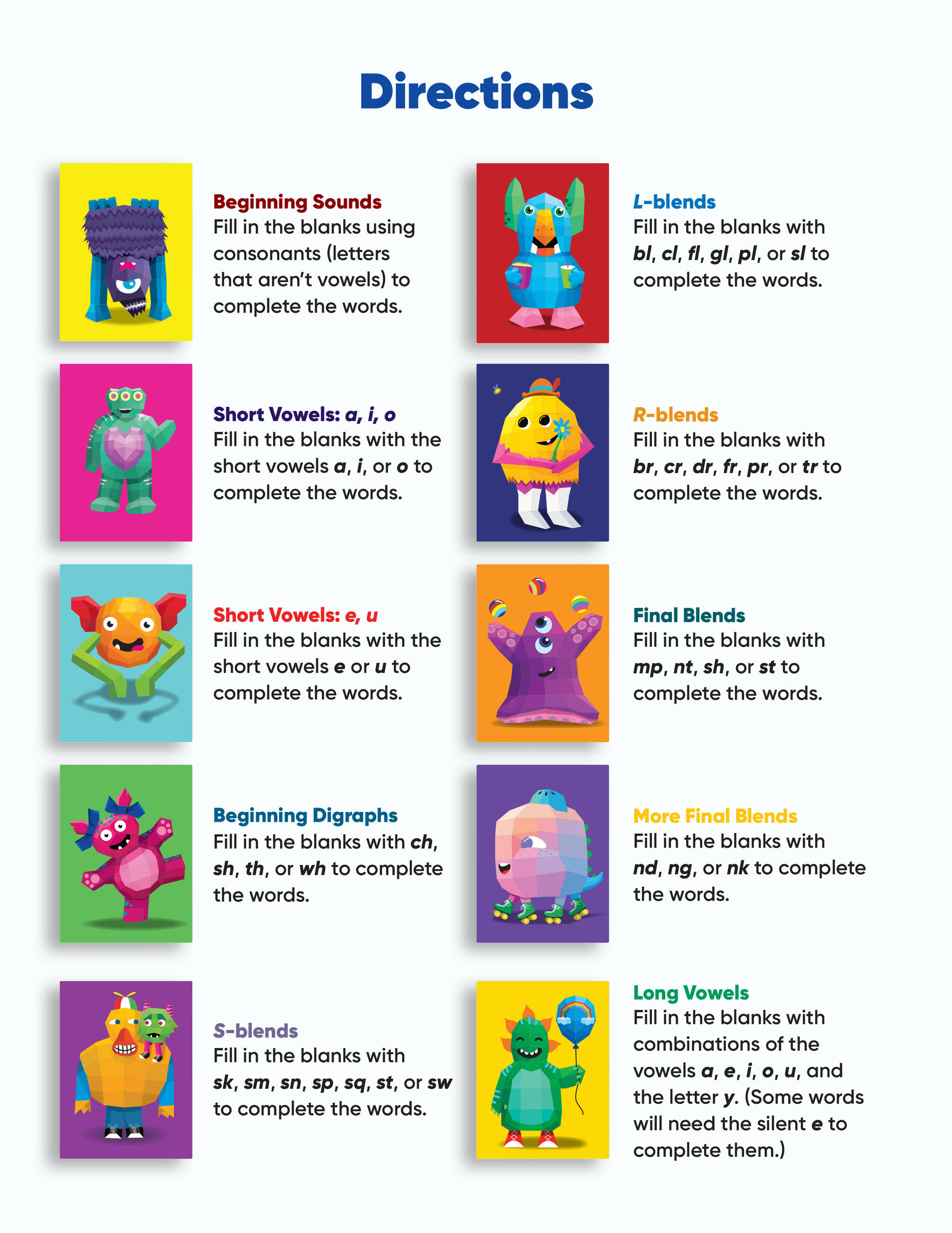 In Learn by Sticker: Beginning Phonics, apply first grade-level phonics concepts (including long vowels, short vowels, initial consonants, and more) to complete words and determine where to place each sticker to create ten sticker images of adorable friendly monsters. Plus, the back of each sticker page contains fun, phonics-related activities like decoding secret messages, finding mystery words, and more.