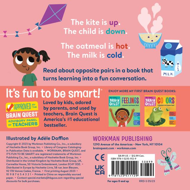 My First Brain Quest: Opposites introduces the concept of opposites, a foundational pre-math observation skill, through ten visually engaging scenes depicting common opposite pairs—up and down, hot and cold, awake and asleep, wet and dry. Smart, colorful, grounded in educational principles and defined by Brain Quest’s signature question-and-answer format, each spread features two illustrations that present the opposite pairs in context while encouraging conversation and observation.