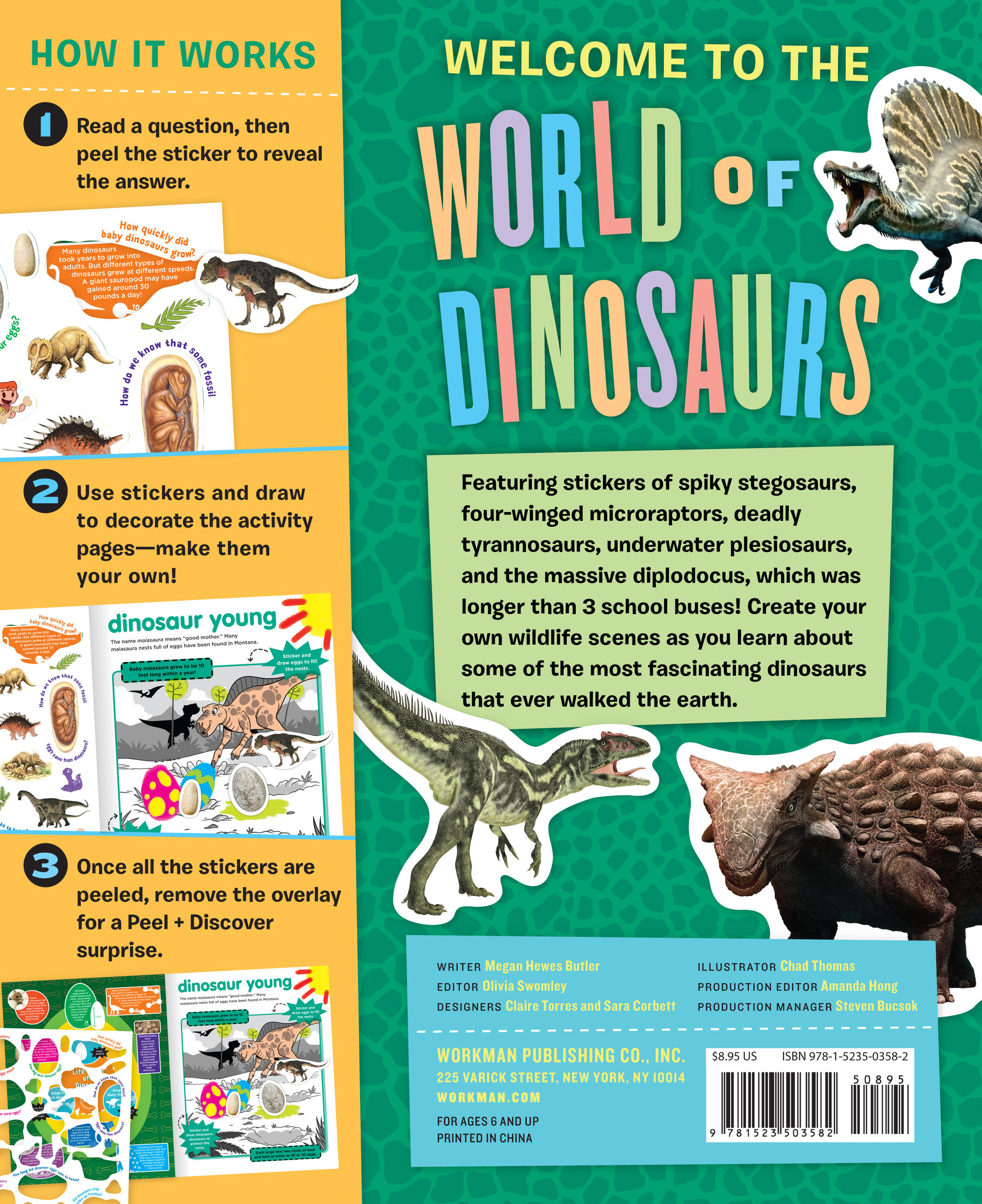 A fun way to learn about dinosaurs with stickers, activity pages, and lots of facts! Featuring stickers of spiky stegosaurs, four-winged microraptors, deadly tyrannosaurs, underwater plesiosaurs, and the massive diplodocus, which was longer than 3 school buses! Create your own wildlife scenes as you learn about some of the most fascinating dinosaurs that ever walked the earth.
